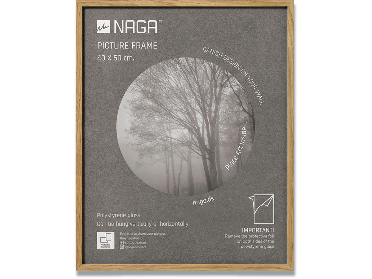 40x50 ramme i massivt egetræ. Moderne ramme med plexiglas udført i massivt egetræ. Den flotte ramme passer til et billede på 40x50 cm. Trærammen måler 1,2 cm i bredden og 2,2 cm i dybden og giver et stilfuldt udtryk. Den fine ramme har metalophæng bagpå, så du nemt kan hænge den op. Rammen er udført så du både kan hænge den vertikalt og horisontalt, på den måde kan du skabe den helt rette billedvæg. En tidløs ramme, som du kan få glæde af i mange år. Indram billeder, din egen eller andres kunst og skab et flot design på dine vægge.