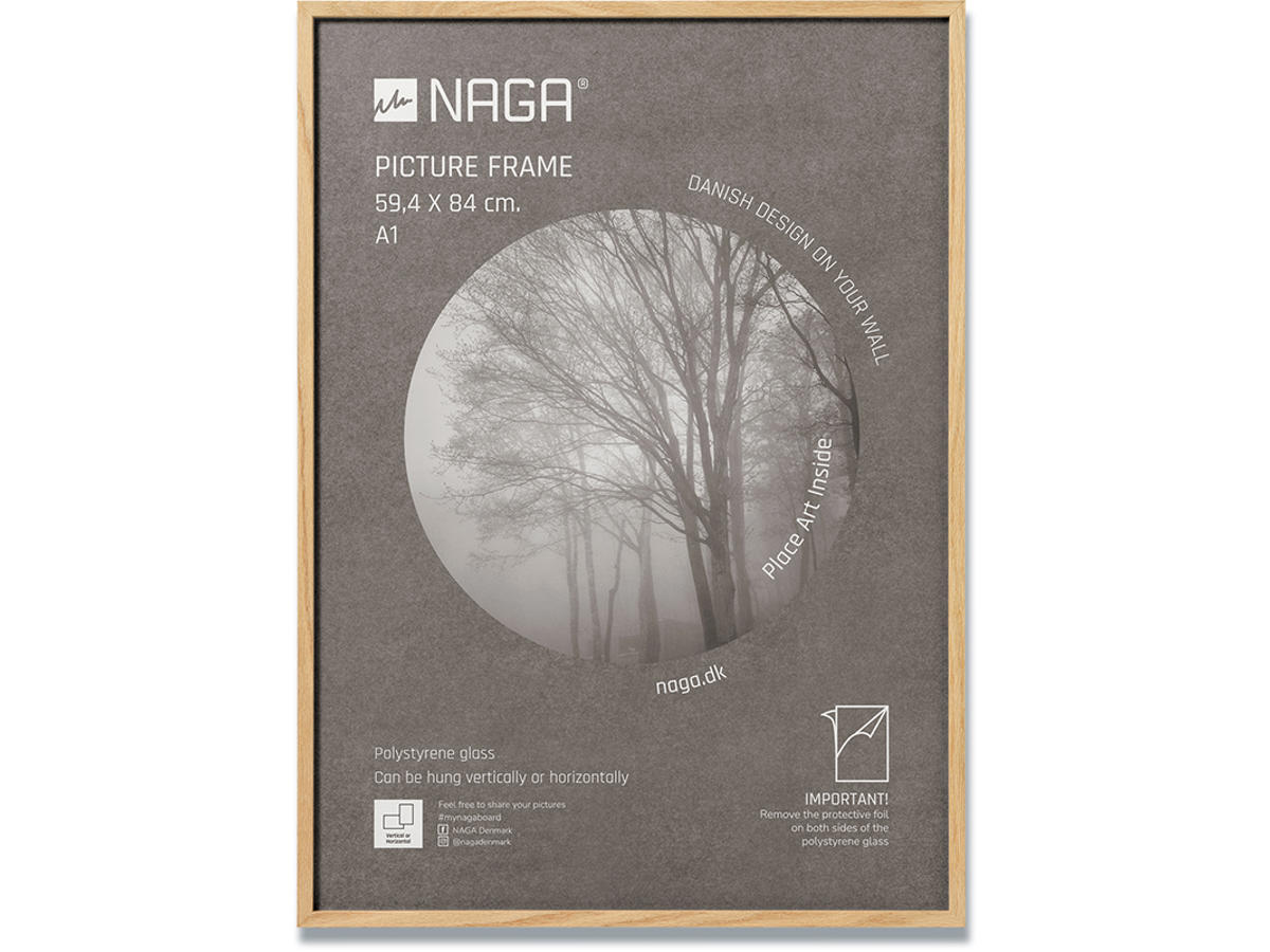 A1 ramme i massivt egetræ. Moderne ramme med plexiglas udført i massivt egetræ. Den flotte ramme passer til en plakat på 59,4x84,1 cm (hvad der svarer til en A1 plakat). Trærammen måler 1,2 cm i bredden og 2,2 cm i dybden og giver et stilfuldt udtryk. Den fine ramme har metalophæng bagpå, så du nemt kan hænge den op. Rammen er udført så du både kan hænge den vertikalt og horisontalt, på den måde kan du skabe den helt rette billedvæg. En tidløs ramme, som du kan få glæde af i mange år. Indram billeder, din egen eller andres kunst og skab et flot design på dine vægge.