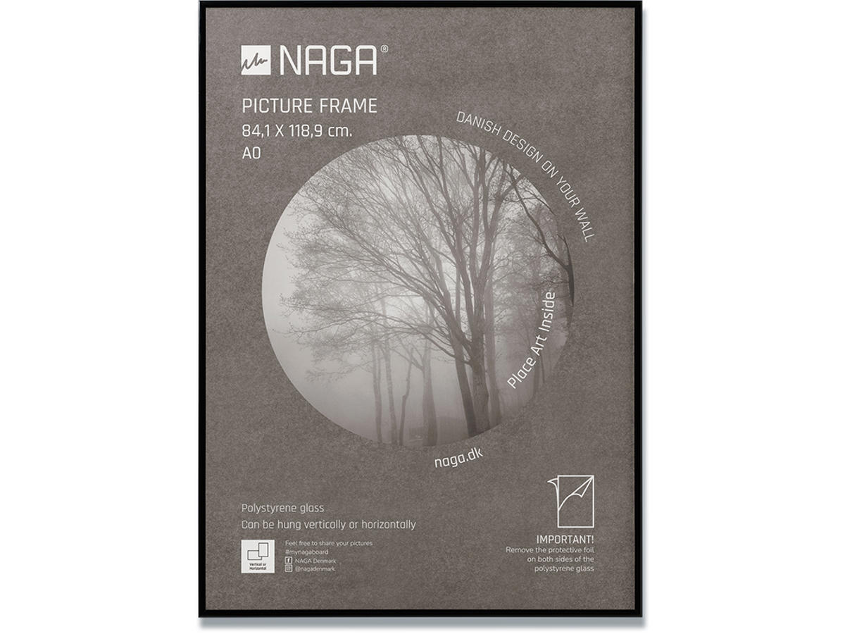 A0 sort ramme i aluminium. Stilfuld sort ramme til billeder med plexiglas udført i aluminium. Den flotte ramme passer til et billede på 84,1 x 118,9 cm, (hvad der svarer til en A0 plakat). Selve rammen måler 0,9 cm i bredden og 1,4 cm i dybden hvilket giver et stilfuldt udtryk. Den fine ramme har metalophæng bagpå, så du nemt kan hænge den op. Rammen er udført så du både kan hænge den vertikalt og horisontalt, hvilket giver dig mulighed for at skabe den helt rette billedvæg. En flot sort ramme, som du kan få glæde af i mange år. Indram billeder eller kunst og skab et stilfuldt design på dine vægge.