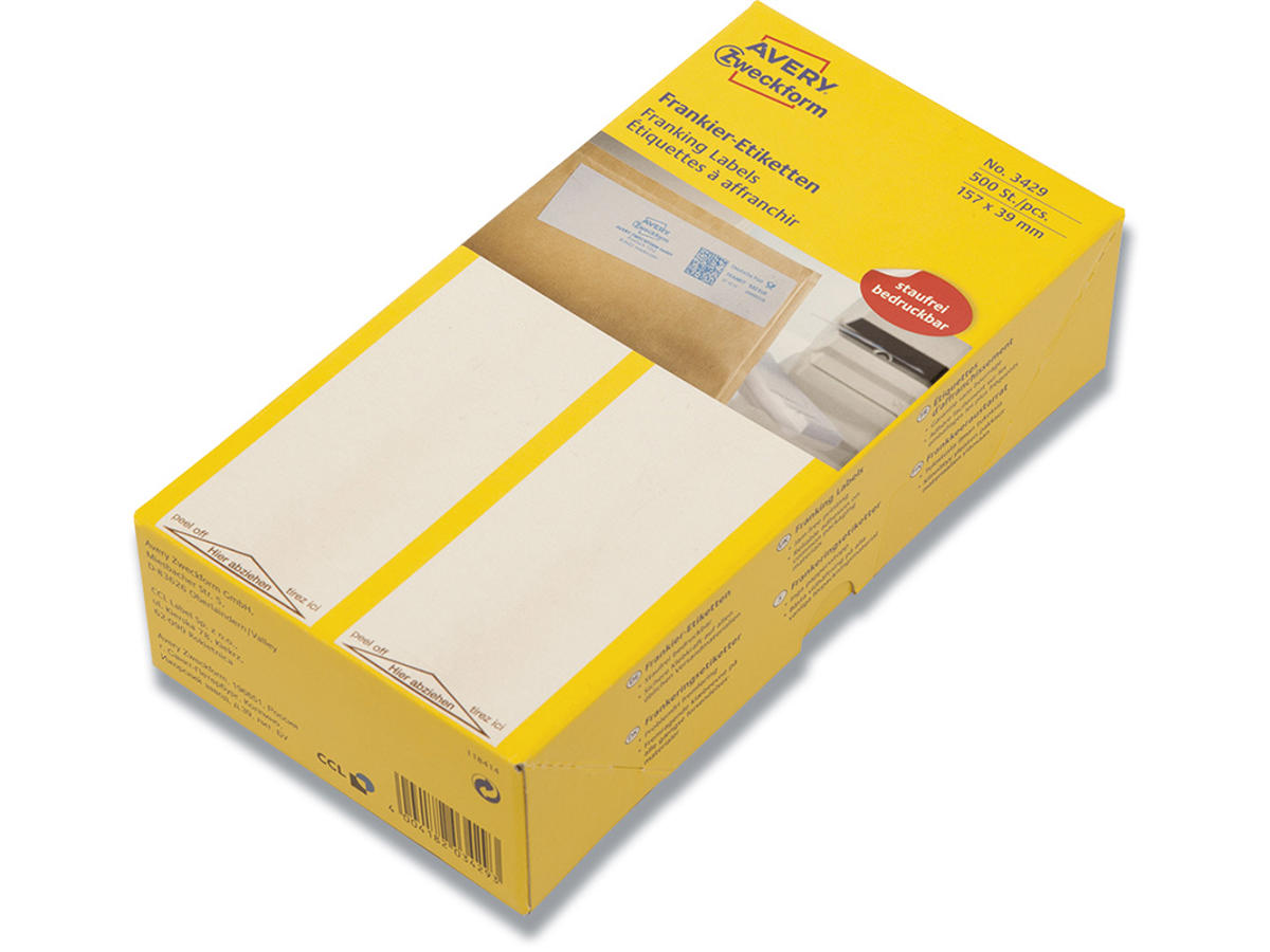 De fleste kontorer har en frankeringsmaskine til når der skal sendes post. Avery's frankeringsetiketter 3429, 157 x 39 mm, med en etiket/ark og 500 etiketter/pk er professionelle frankeringsetiketter på ark til Neo Post frankeringsmaskiner (Neo IJ-65 - IJ-110 (Frankit-Modelle), IS-440, IS-480) og er et optimalt og økonomisk alternativ til dig, som gerne vil bruge frankeringsetiketter optimeret og tilpasset din Neo Post frankeringsmaskine, men samtidig vil have den gode Avery kvalitet.