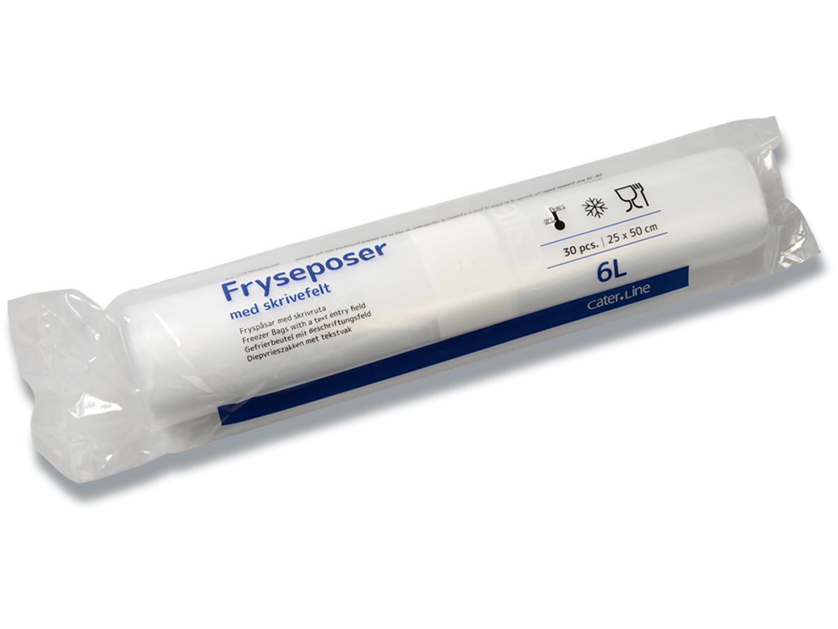 Denne frysepose er fremstillet af polyethylen og er produceret med godkendelse til fødevarer iht. 1935/2004/EU. Plastposen må derfor anvendes til alle slags fødevarer. Poly-Line fryseposen måler 500 x 250 mm og kan rumme op til 6 liter. Det praktiske påtrykte skrivefelt, gør det nemt at påføre fryseposens indhold. Den transparente plastikpose kan anvendes i temperaturområder fra -30° til 40° i ubegrænset tid. 1 rulle indeholder 30 stk. fryseposer, og perforering gør det nemt at afrive hver enkelt pose.