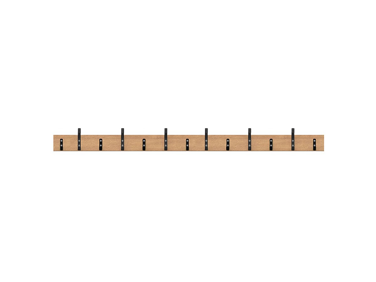 Knagerække type 103 med 6 stk. lange skolekroge og 7 stk. korte kroge. Sorte kroge, RAL 9005 og liste i birk højtrykslaminat, bredde 2000 mm