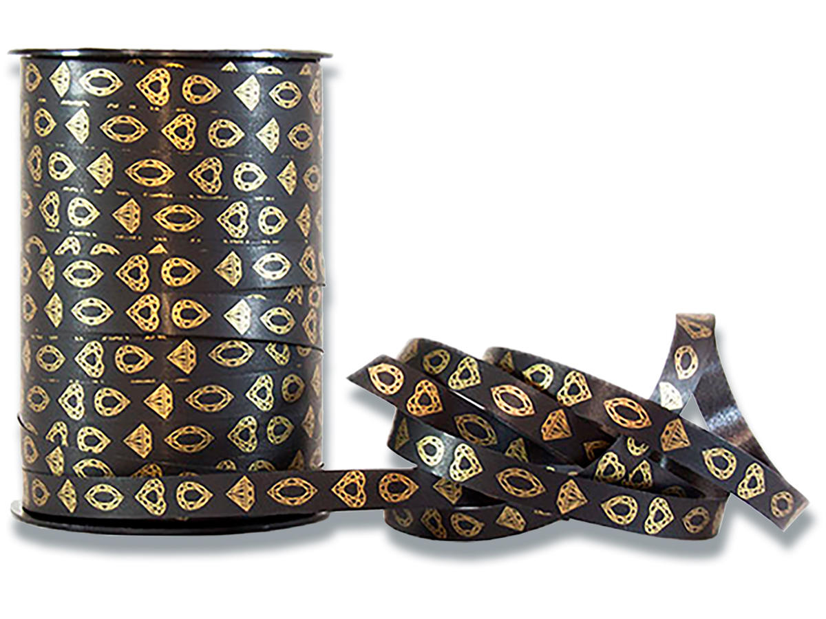 Polybånd gavebånd Juvel, sort med tryk i guld, er et eksklusivt og helt specielt gavebånd. Det perfekte gavebånd til f.eks. smykkegaver, men tilfører alle typer gaver et unikt og personligt præg.