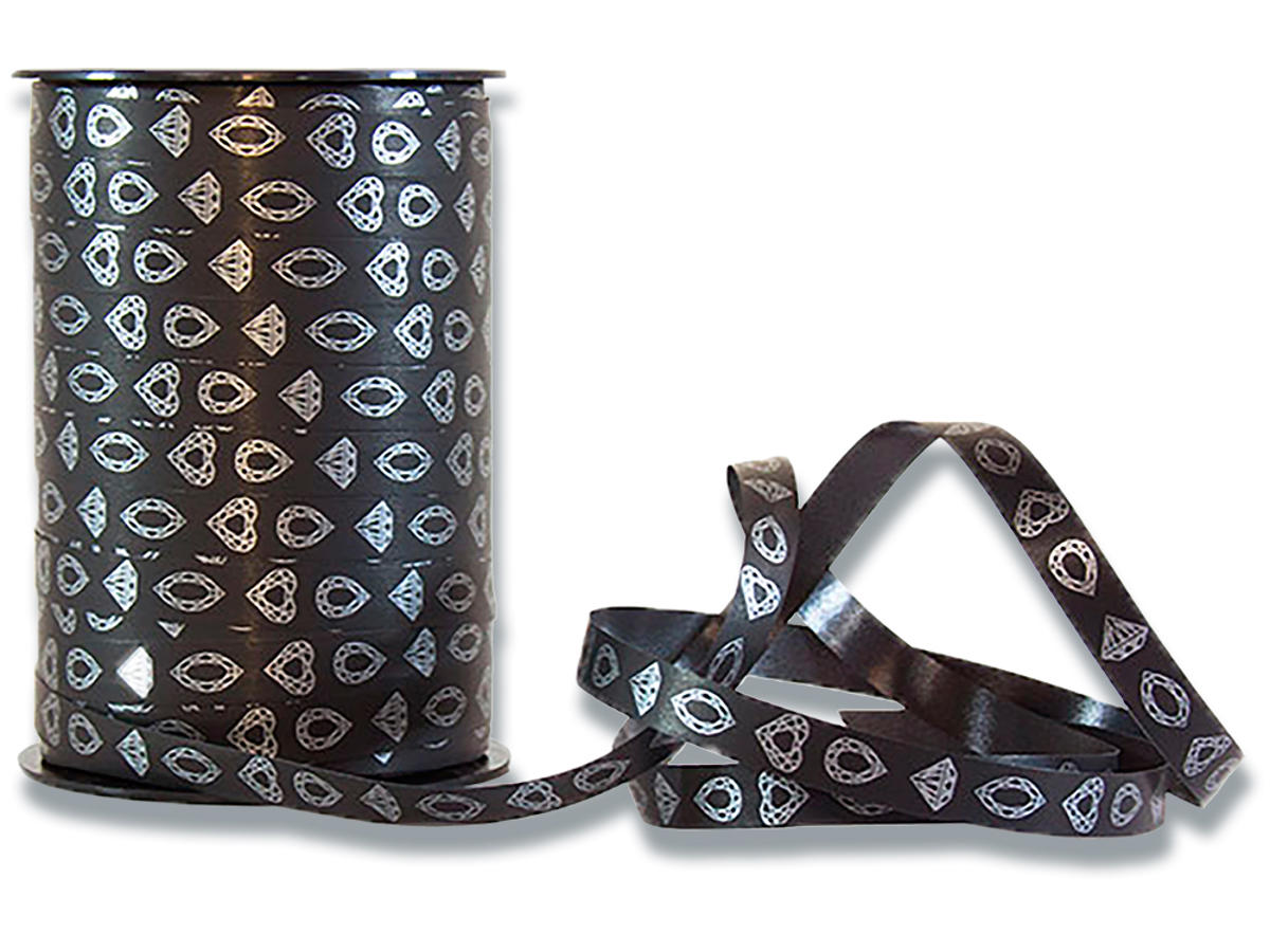 Gavebånd, PP, 10mm x 225m, Sort med sølv print, Roliba Poly Glat Juvel