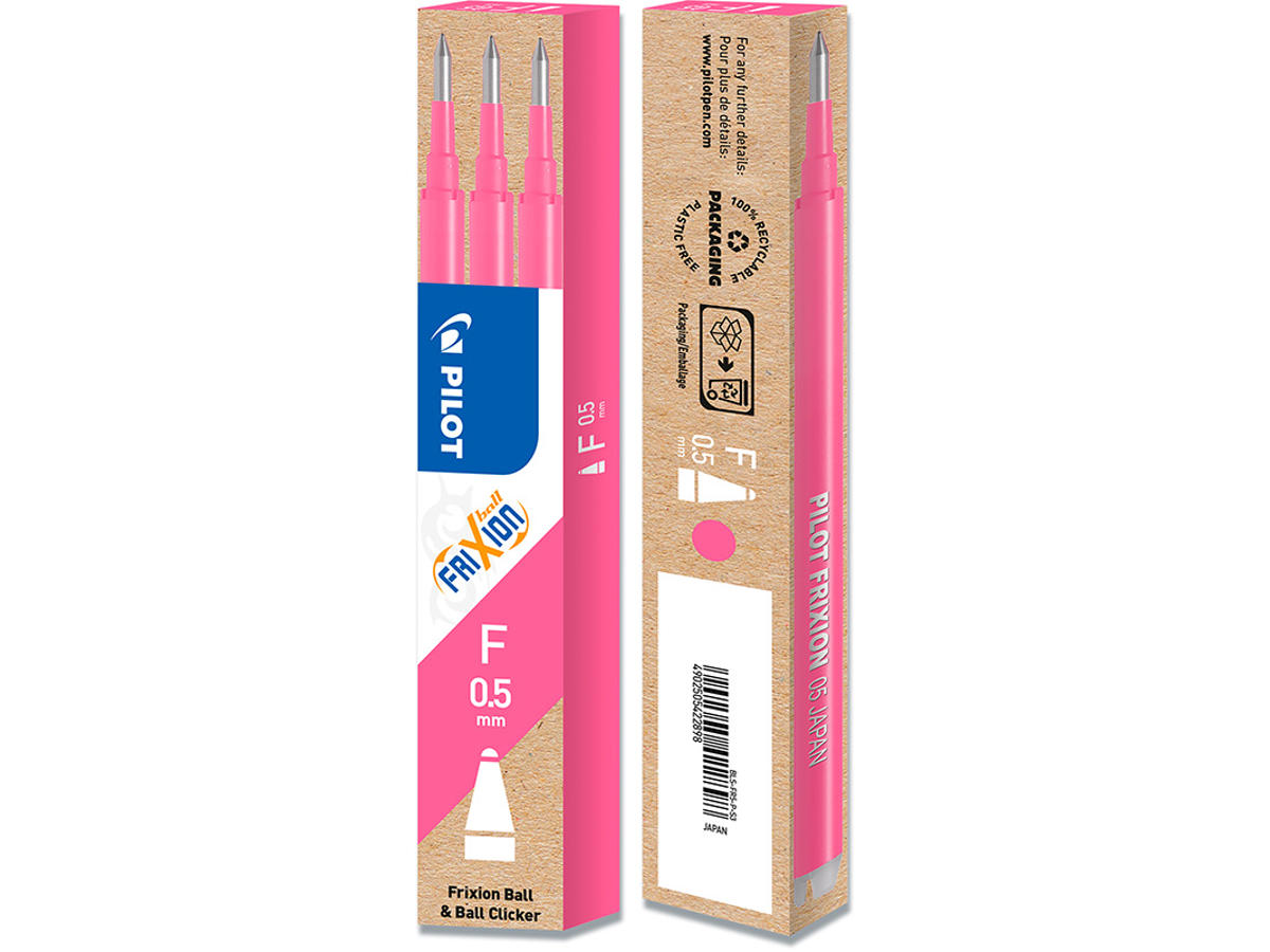 FriXion pennen er med en helt ny revolutionerende blæk, hvor det skrevne let kan viskes ud igen. Blækket er varmefølsomt, og forsvinder ved den friktion der opstår, når der gnides på det skrevne. Der kan skrives, slettes og rettes i det uendelige uden at papiret ødelægges. Pennen glider let hen over papiret med en klar og tydelig streg. Sæt med tre refills i etui til FriXion Ball, FriXion Slim og FriXion Clicker. Fin spids.
