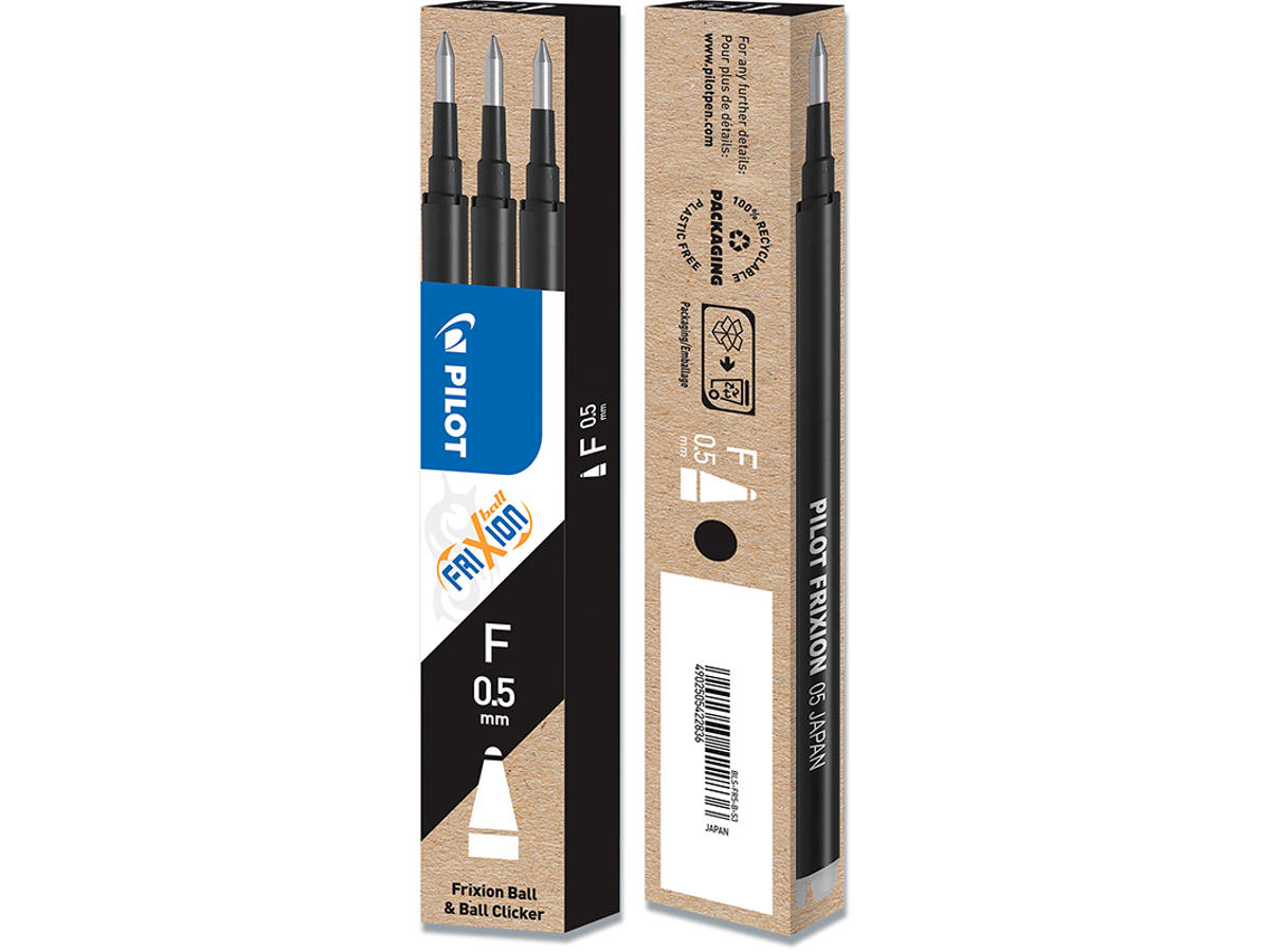 FriXion pennen er med en helt ny revolutionerende blæk, hvor det skrevne let kan viskes ud igen. Blækket er varmefølsomt, og forsvinder ved den friktion der opstår, når der gnides på det skrevne. Der kan skrives, slettes og rettes i det uendelige uden at papiret ødelægges. Pennen glider let hen over papiret med en klar og tydelig streg. Sæt med tre refills i etui til FriXion Ball, FriXion Slim og FriXion Clicker. Fin spids.