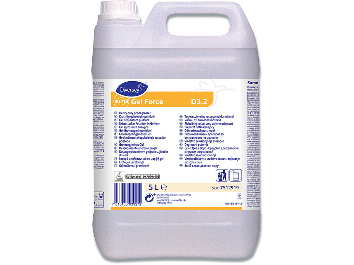Alkalisk flydende rengøringsmiddel, som giver en forbedret vedhæftning på overflader, der skal rengøres, og er derfor mere effektiv. Suma Gel Force D3.2 er baseret på en helt ny teknologi inden for "vedhæftning på overflader". Blandet med vand, udvikles en "thixotropisk" gel, som giver en fantastisk vedhæftningsevne og dermed medvirker til at øge kontakttiden, så virketiden på kraftig besmudsning forlænges. Produktet er velegnet til udlægning med skumudstyr.