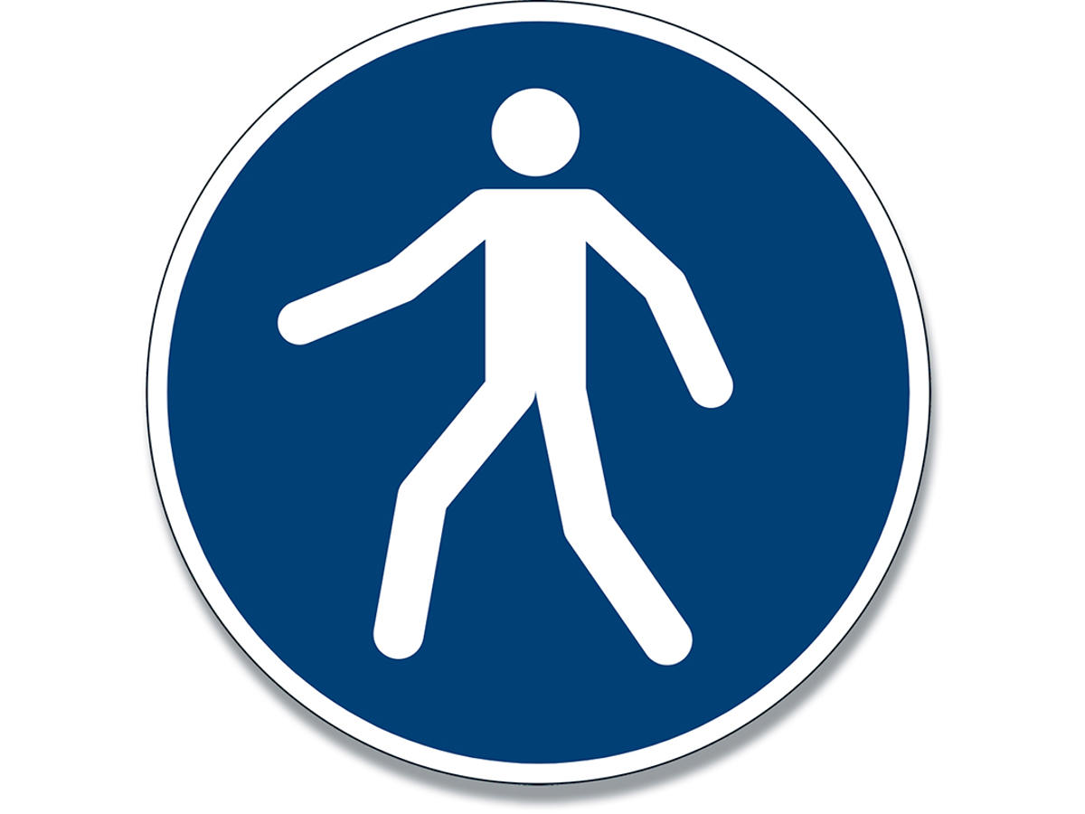 Registreret gulv sikkerhedsafmærkning til identifikation af farlige områder, opbevaringsrum, gangbroer m.m.. Registreret advarselsklistermærke "Tilladt for gående" M024 i henhold til ISO 7010. Selvklæbende til påsætning på indendørs gulve i lagerhaller, distributionscentre, produktionshaller m.m.. Slidstærk og hårdfør. Kompatibel med ISO 7010. Skridsikring R9 i henhold til DIN 51130. Mål: Ø 430 mm, tykkelse 0,4 mm