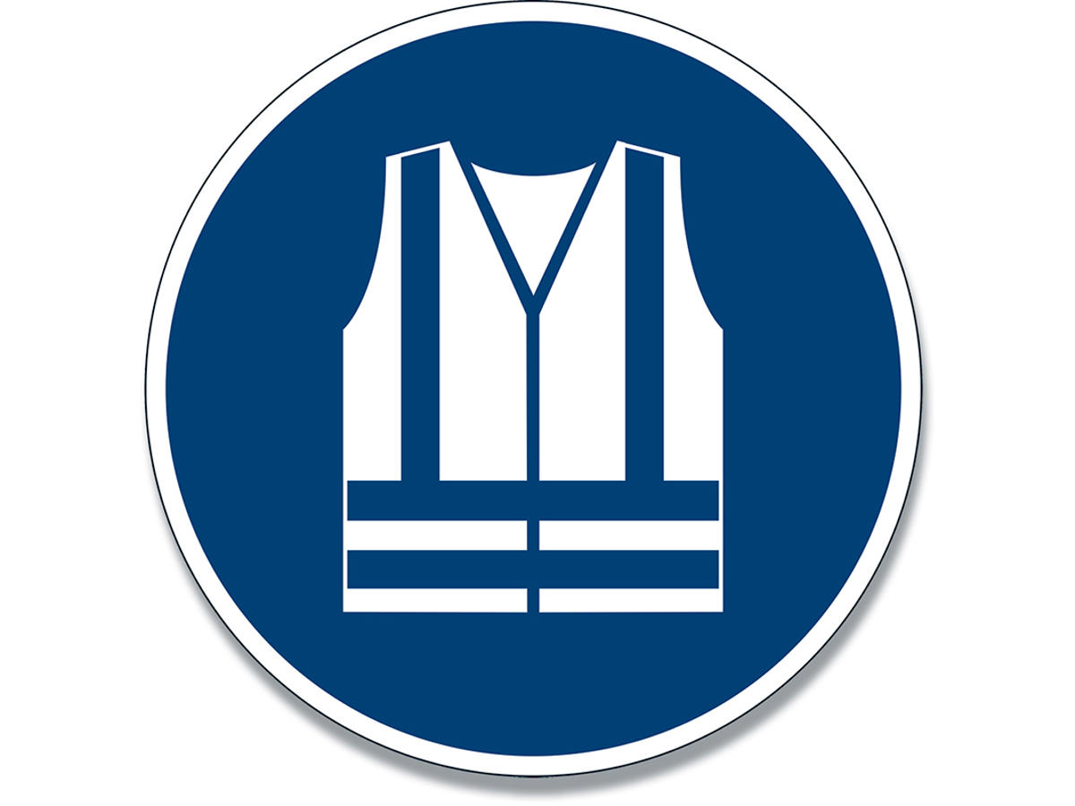 Registreret permanent påbudsskilt "Anvend sikkerhedsvest" M015 i henhold til ISO 7010.