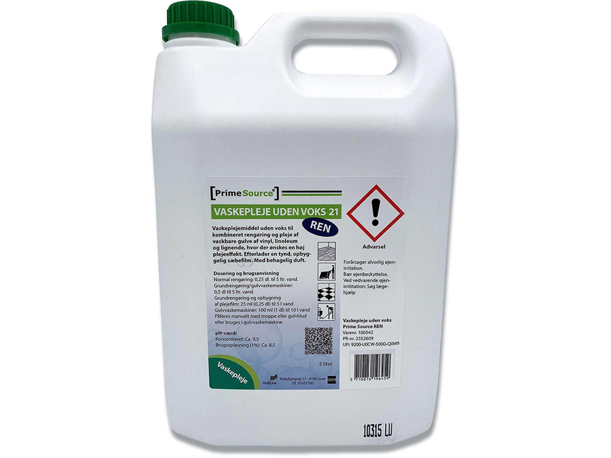 Prime Source Ren 21 uden voks er et vaskeplejemiddel til kombineret rengøring og pleje af vinyl-, træ- og linoleumgulve, hvor der er ønske om en høj plejeeffekt. Mild 21 er en uklar, grøn væske med tilsat duft der efterlader en tynd film, som plejer over tid. Det anbefales altid at læse databladet når du handler kemi.