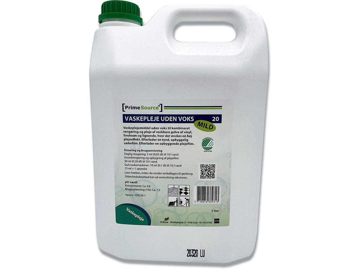 Prime Source Mild 20 vaskeplejemiddel uden voks er til kombineret rengøring og pleje af træ-, linoleum- og vinylgulve hvor der ønskes en høj plejeeffekt. Mild 20 efterlader en tynde og opbyggelig plejefilm der forlænger gulvets levetid. Det anbefales altid at læse databladet når du handler kemi.