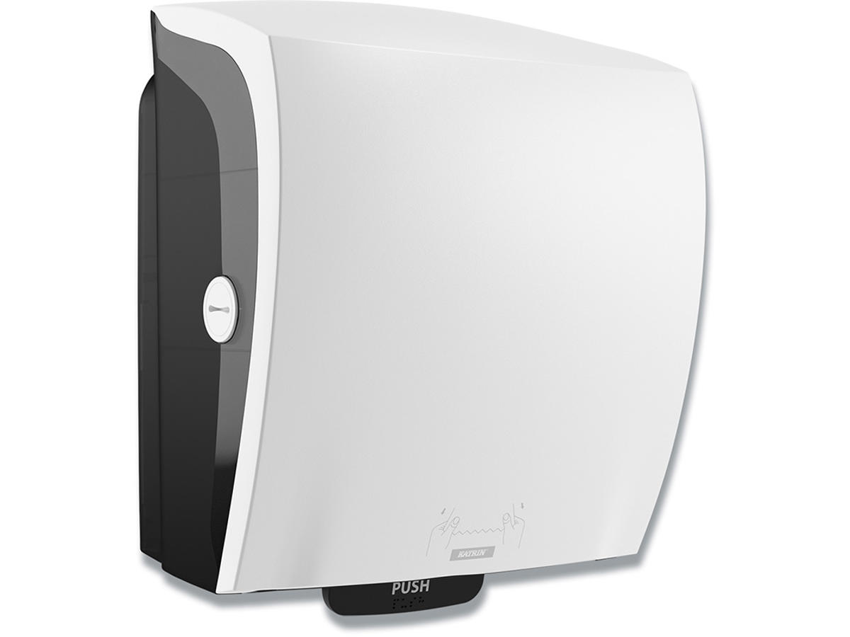 Denne Katrin dispenser er udformet med henblik på alle brugere og med fokus på god funktion. Dispenseren er ergonomisk udformet og nem at anvende for alle. Det er desuden nemt at vedligeholde dispenseren takket være innovative funktioner. Papirniveauet er let at kontrollere, takket være de transparente sidepaneler og hele håndklæderullen anvendes altid. Når det ikke er til at se papiret, er der en nem-at-bruge knap, som finder papiret frem igen. Dispenseren har mange gode funktioner, som blandet gør den nem at rengøre.