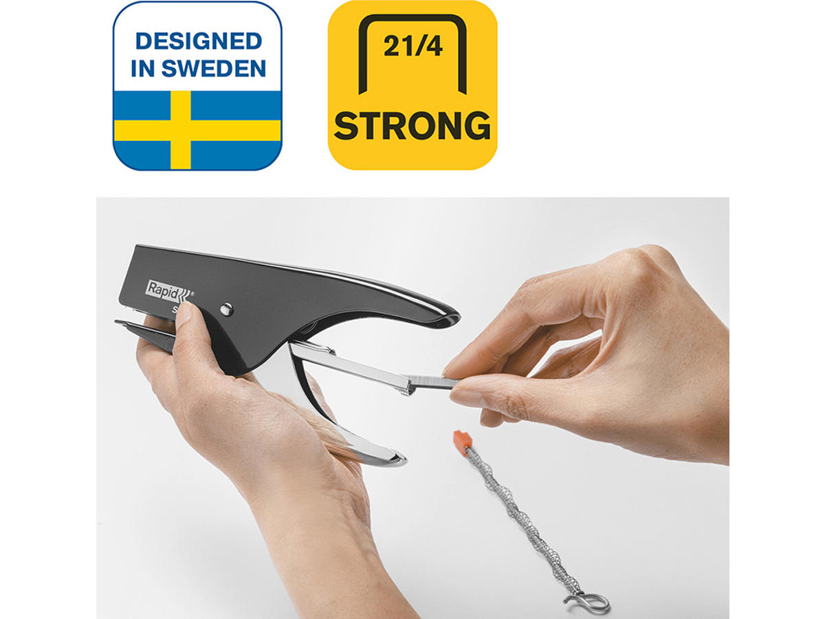 Alt i stål og gribevenlig hæftetang med sprøjtelakeret behandling. Handy i hjemmet, skolen eller kontoret, hvor der kun kræves mindre hæfteopgaver.