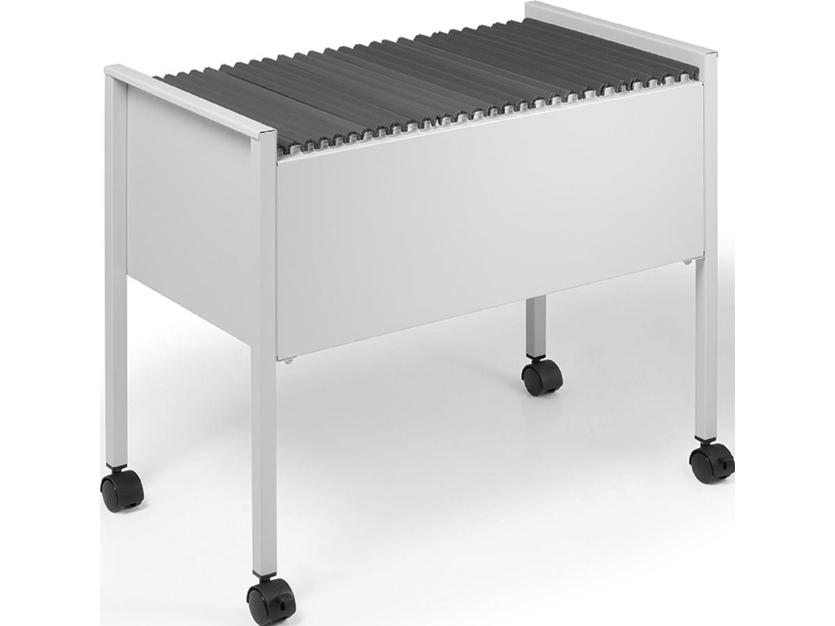 Hængemappevogn til ca. 80 stk. A4-hængemapper. Udstyret med fire hjul, to med bremser til stabilitet under brug. Af epoxy polyester belagt stål til at give ridsefast overflade. Leveres flad pakket med monteringsvejledning. Mål:BxHxD 655x592x368mm