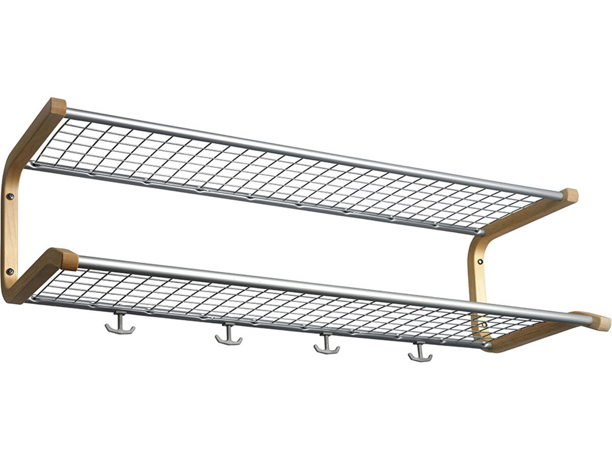 - Hylde i stål, konsol i formstøbt træ og kroge i plast.