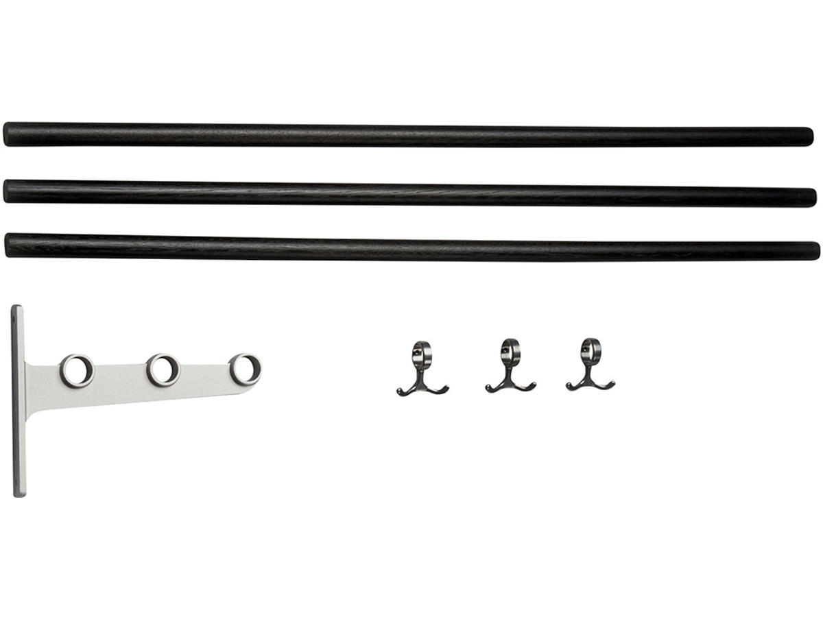 - Rundstokke i træ eller metal og konsoller samt kroge i genanvendt aluminium. De metaller, der ikke er behandlet som f.eks. aluminium, messing og kobber, er i deres rå design, og der kan være variation fra emne til emne. Træ er også et materiale, der kan variere i udseende.