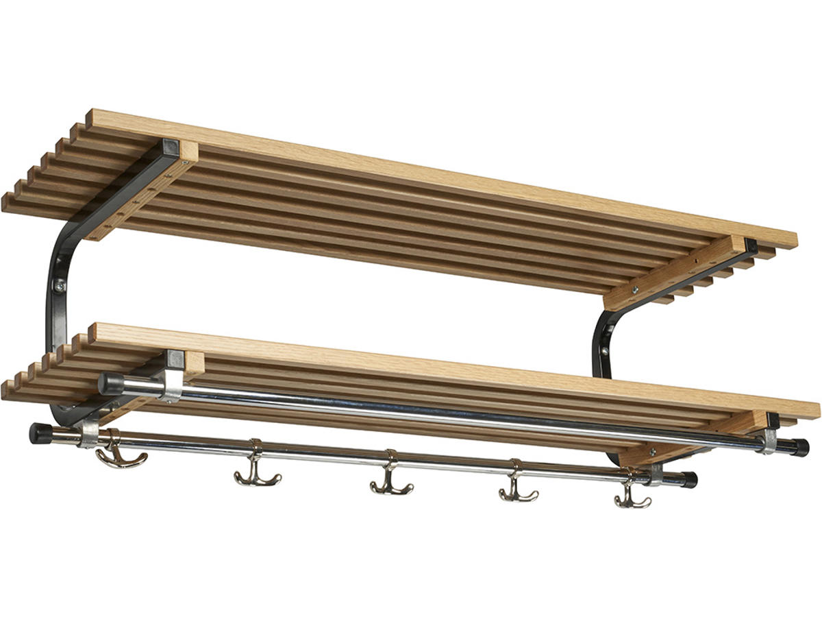 Hattehylde med trælameller i lakeret fyrretræ, bøg, birk, eg samt i sort eller hvid. Bøjlerøret og røret med kroge er i 19 mm forkromede stålrør. Kroge i blankpoleret messing. Konsoller i lakeret hvid eller sort som standard. BEMÆRK! Billedet ovenfor viser hvordan hattehylden ser ud i bredden 1000 mm. Det der er forskelligt fra bredde til bredde, er antallet af kroge.