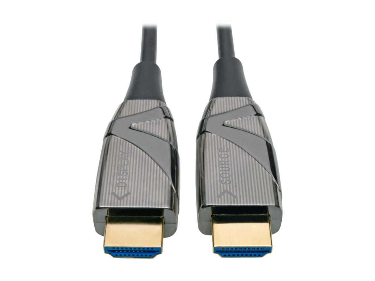 Because the fiber cable is slimmer and more flexible than standard copper HDMI cables, the P568-100M-FBR is easier to install around corners and in hard-to-reach spaces behind equipment. It draws power from the connected device, so no external power supply is needed to transmit the HDMI signal across the longer distances unique to fiber optic cabling. Note