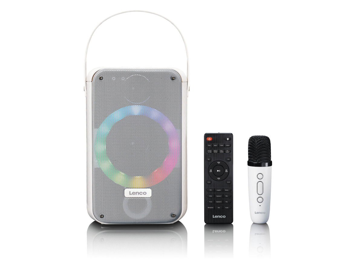 With the Lenco BTC-060WH, you're getting a complete karaoke set equipped with Bluetooth®, rechargeable battery, wireless rechargeable karaoke microphone, disco LED lighting, and a remote control with sound effects and voice changer. We can hardly imagine it, but aren't you a fan of karaoke? The BTC-060WH is still the right choice for you. The karaoke microphone conveniently stores in the Bluetooth speaker. With its portable design and a weight of just 1.42 kg, take the speaker anywhere you go. Enjoy up to 12 hours of uninterrupted fun with the built-in rechargeable 2400mAh battery. With the Lenco BTC-060WH, the party is literally in your hands! Let's get this (karaoke) party started!