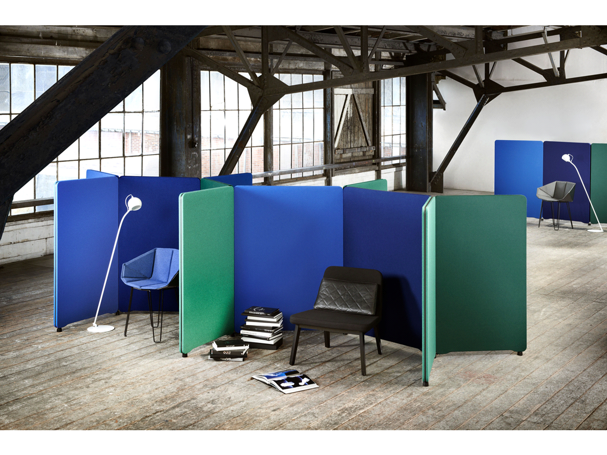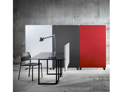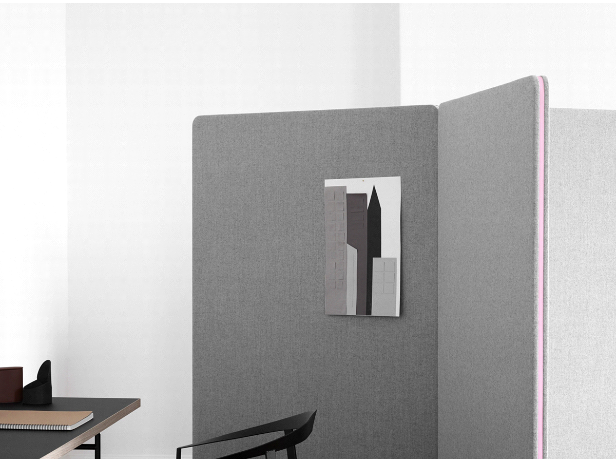 En moderne gulvskærm med rent design og lydabsorberende egenskaber. Kantliste af gummi i syv farver, justerbare fødder og fire forskellige standardstoffer, giver store valgmuligheder. Skærmene er opbygget med 40 mm polyesterfyld som effektivt absorberer lyd og skaber et mere harmonisk miljø. De indbyggede magneter gør skærmvæggene nemme at koble samme og enkle at flytte.