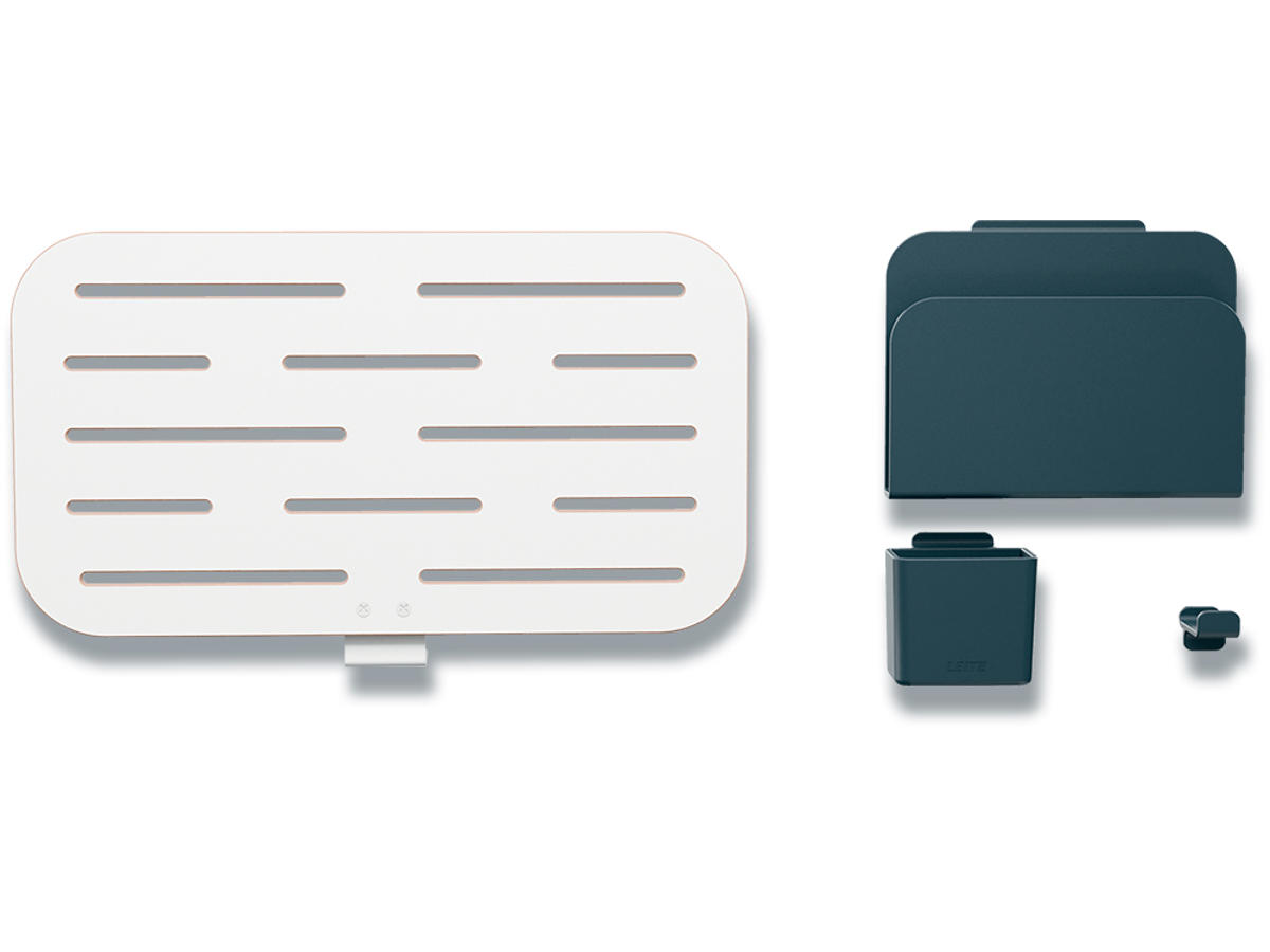 Hold alle dine væsentlige ting organiseret, nemme at finde og frigør værdifuld plads på skrivebordet. Du skal blot placere det stærke opbevaringstilbehør i 85% recirkulerede plast (1 x notesblokholder, 1 x penneholder og 1 hængekrog til et headset) på organiseringstavlen for at skabe dit eget personlige arbejdsområde.