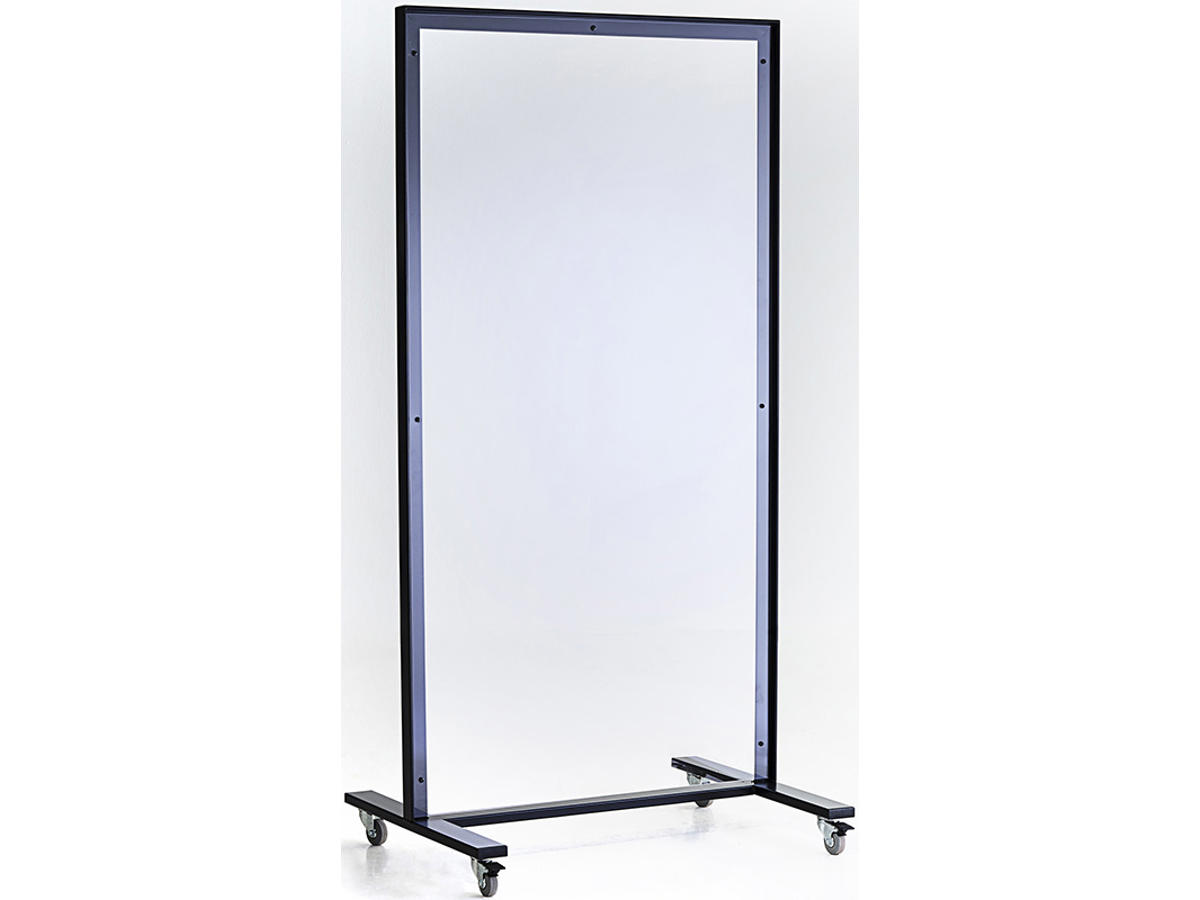 Robust gulvafskærmning med ramme i pulverlakeret metal.