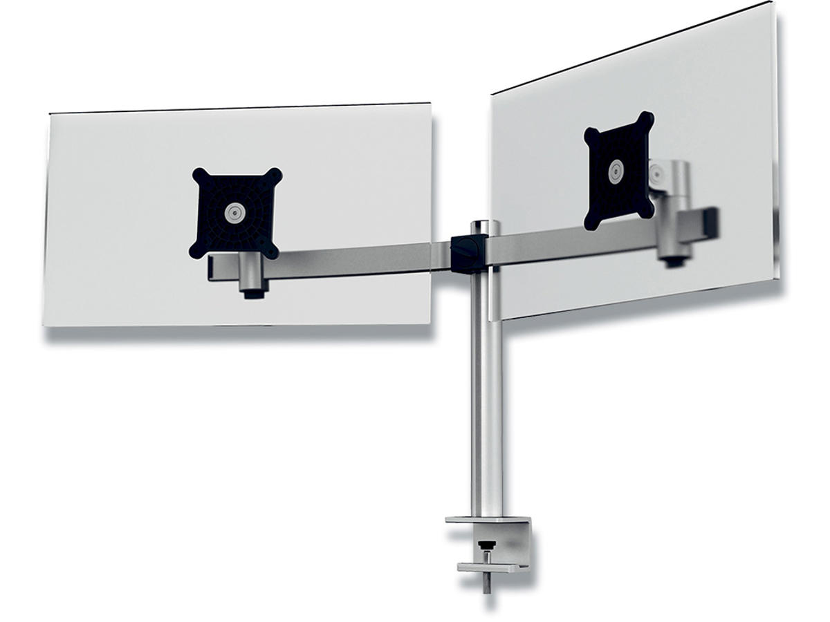- Justerbar bordmontering af skærmholder til 2 skærme