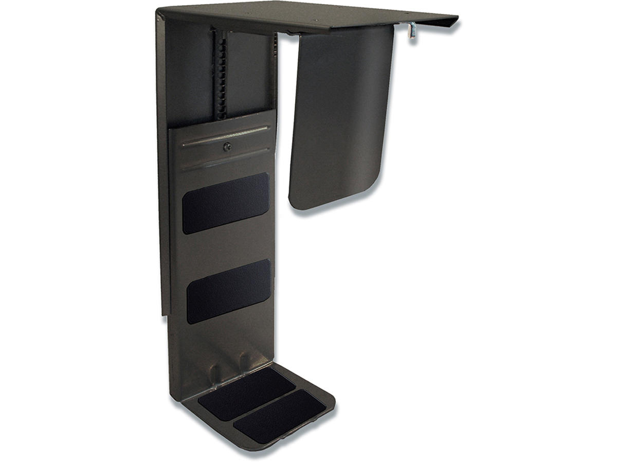 202 TWIN LINE CPU Holder er monteret med beskyttende skum-pads for at undgå, at kabinettet får ridser ved montering. •Under bordplade på min. 20 mm •Belastning max. 30 kg. •Skruer og tegning er vedlagt •Optimal til hæve/sænke borde.