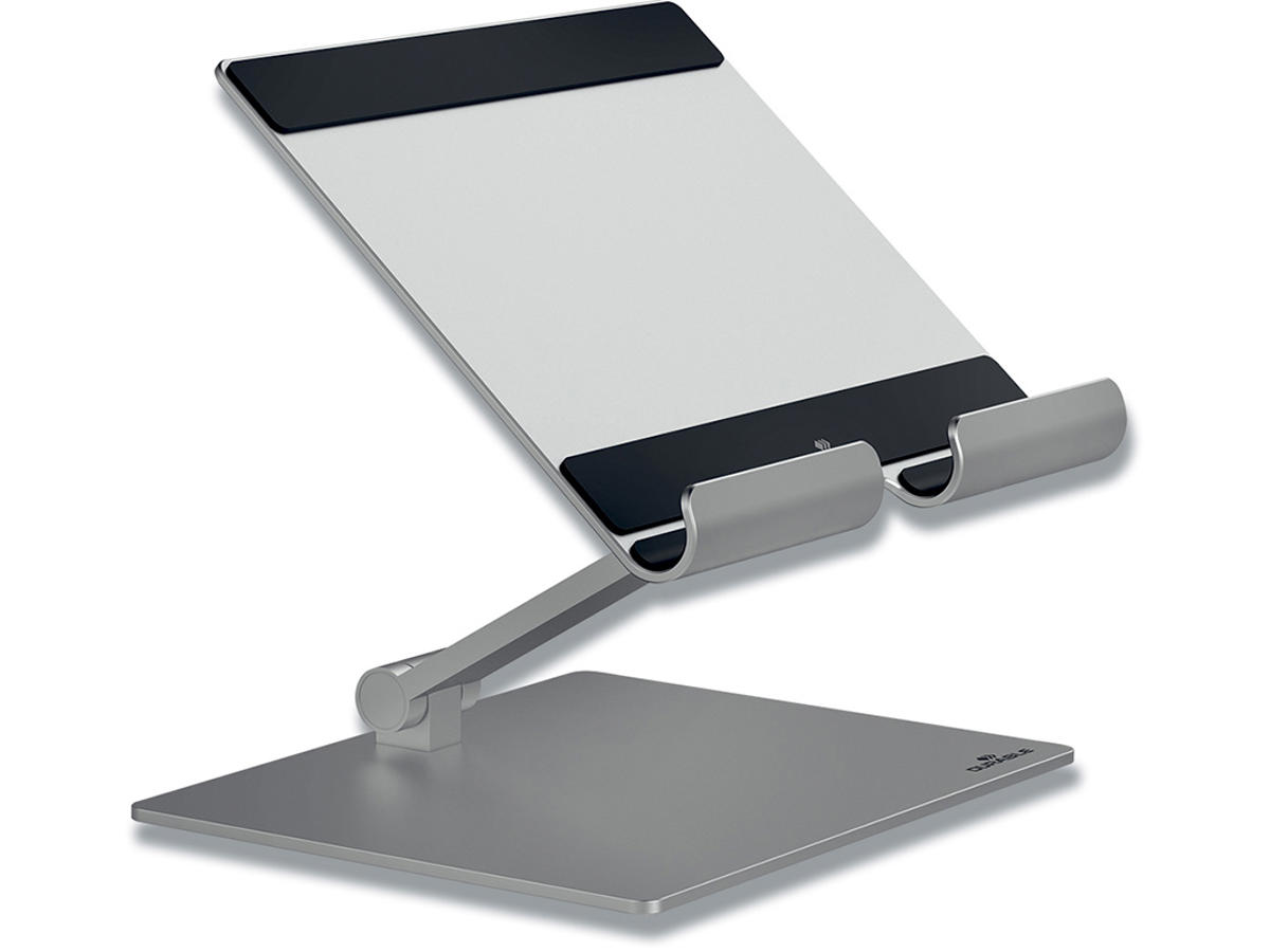 Mere digitalt hjemmearbejde, virtuel læring og et stigende medieforbrug har øget brugen af tablets. En tabletholder gør brugen mere praktisk og ergonomisk, f.eks. på Teams møder, plejehjem for at holde kontakten med dine kære, digitale magasiner, sociale medier eller på rejser. Tablet Stand RISE er et foldbart bordstativ som passer til tablets på op til 13" med en maksimal vægt på 1 kg. Fremstillet af op til 40 % genanvendt 3,5 mm tykt aluminium. 100% genanvendelig. Placeres i holderen i stående eller liggende format. Trinløs justering af højde og læsevinkel. Gummipuder og stopkant forhindrer tabletten i at glide ud af stativet. Gummipuder på undersiden beskytter bordets overflade mod ridser og holder stativet stabilt.
