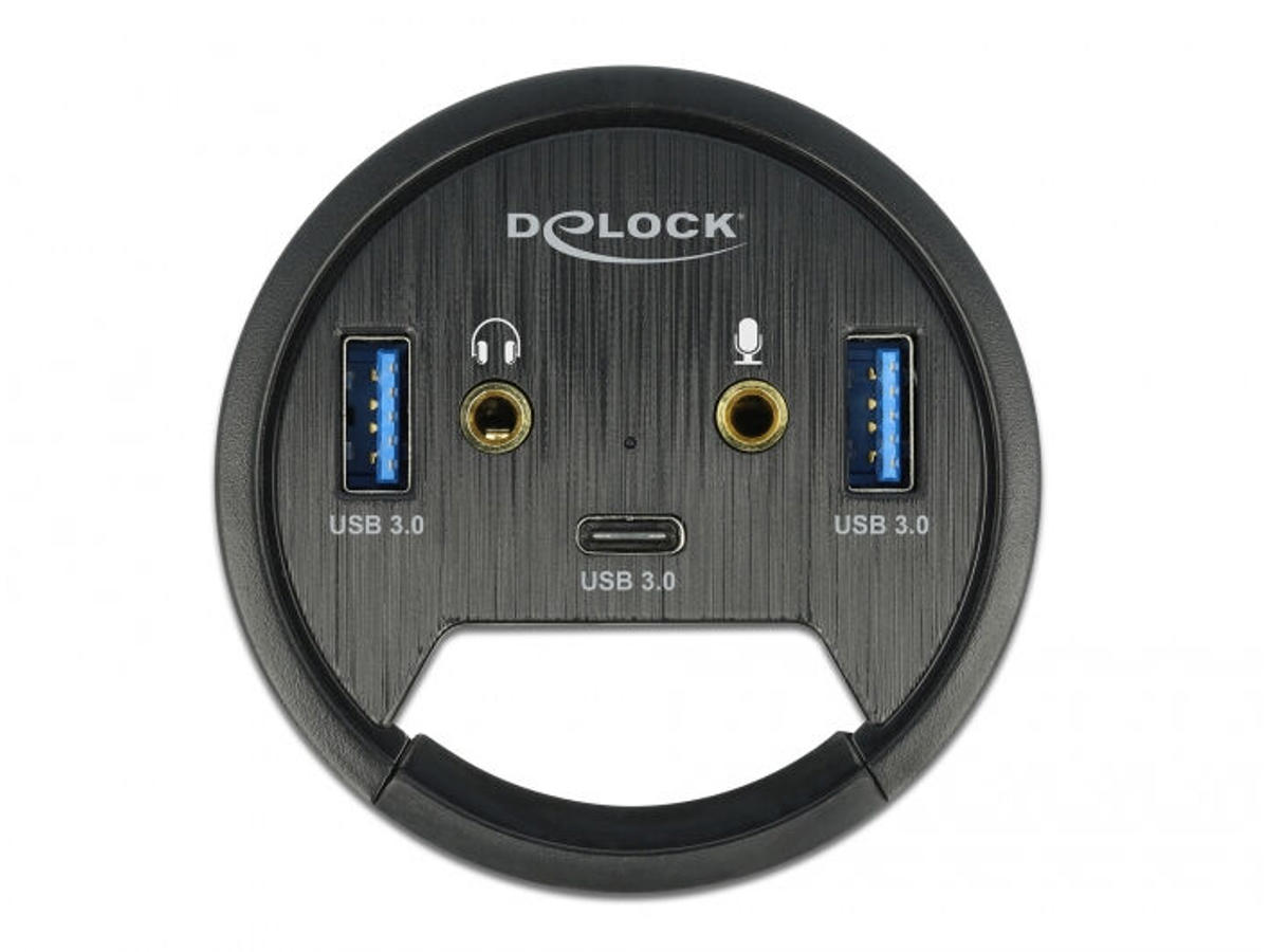 This hub by Delock can be installed into an existing cut-out of the desk with a diameter of 60 mm and can be connected to a computer via the USB Type-A interface. It expands the computer by two USB Type-A ports and one USB Type-C port.