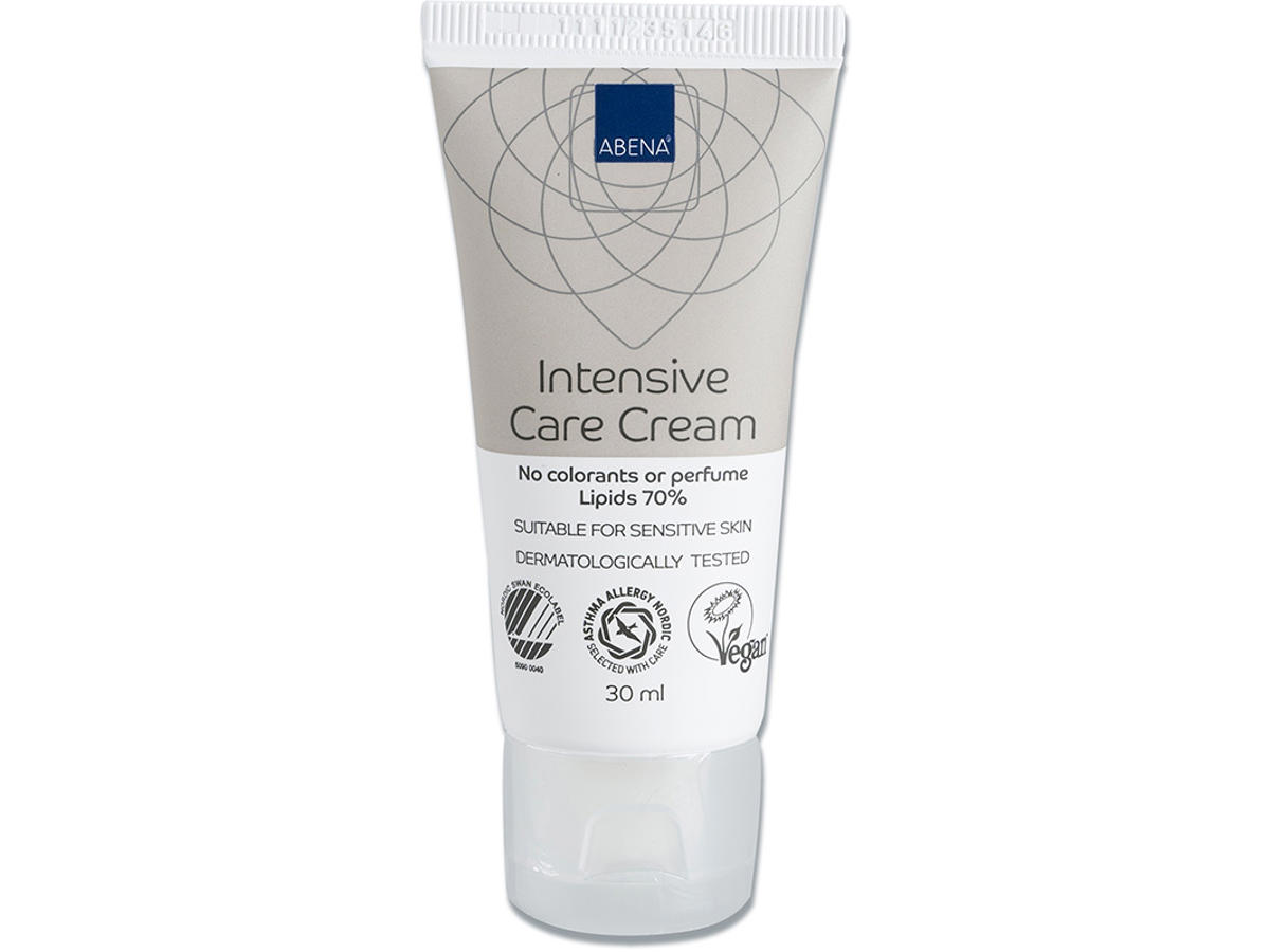 Abena Intensive Care Cream er egnet til alle hudtyper og hjælper huden med at genopbygge dens naturlige fugtighedsbalance. Cremen er velegnet til pleje af meget tør, irriteret og skadet hud samt atopisk dermatitis, eksem, udslæt og psoriasis. Det høje fedtindhold (70%) hjælper genopbygningen af hudens barriere uden at huden føles fedtet. Kan bruges på såvel hænder som krop, ansigt og endda på fødderne pga. det høje fedtindhold. Cremen har en rigtig god barriereeffekt fra den påføres til op til 8 timer efter. Kan bruges på både børn og voksne. Cremen ophæver ikke virkningen af klorhexidin. Indeholder ingen farvestoffer eller parfume. Til daglig brug på tør og sensitiv hud. Må bruges så ofte som der ønskes. Påfør og smør ind i et tyndt lag. Doseres efter behov. Kun til udvortes brug. Kom ikke produktet i øjnene.