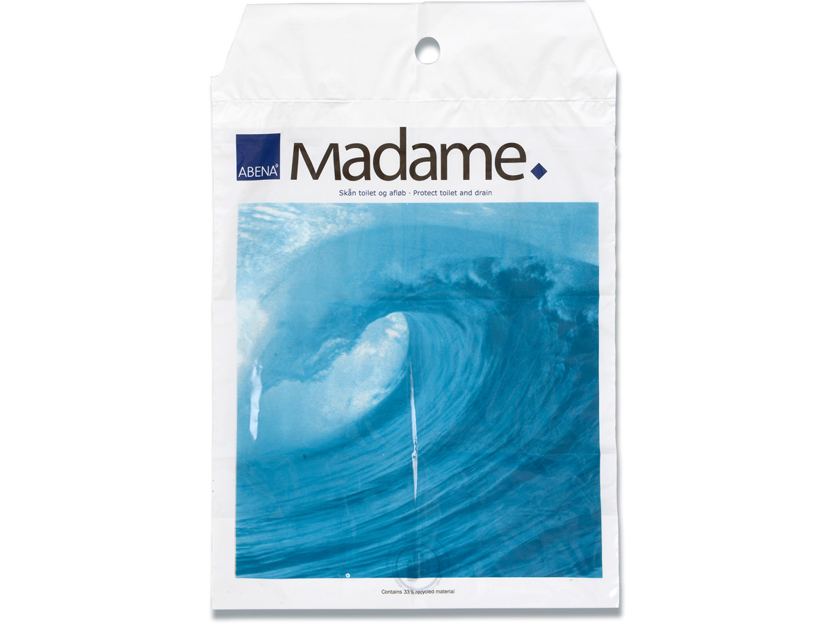 Affaldspose til dametoilet. Bruges til hygieneaffald. Den har en 7 cm kanal til montering på pose holder. Ingen foldning, med bundfals på 5 cm. Med ''Madame'' tryk.