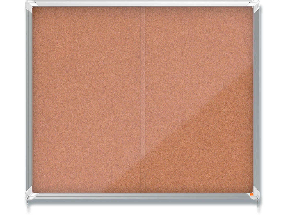 Kork, låsbart opslagsskab med skydelåge og integreret hjørnelås. Komplet med moderne, stilfuld aluminumsramme og vægmonteres gennem hjørnerne. Kork opslagstavle overflade til sikkert at sætte dine noter på med kortnåle. Størrelse: 15xA4 ark.