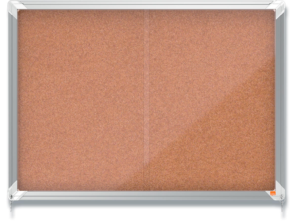 Kork, låsbart opslagsskab med skydelåge og integreret hjørnelås. Komplet med moderne, stilfuld aluminumsramme og vægmonteres gennem hjørnerne. Kork opslagstavle overflade til sikkert at sætte dine noter på med kortnåle. Størrelse: 8xA4 ark.