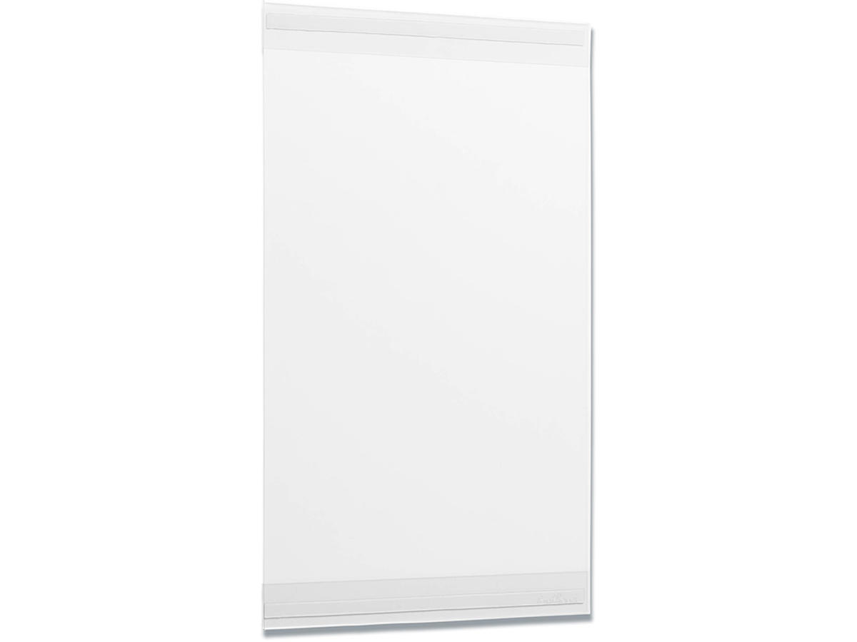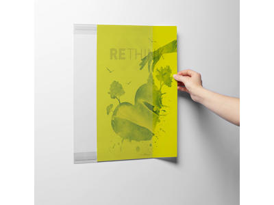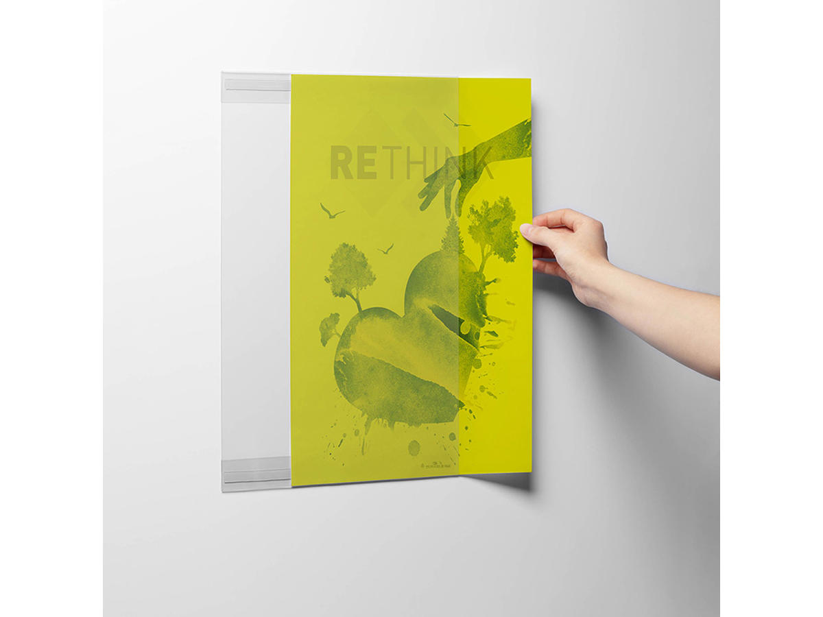 Selvklæbende infolomme hvor folien er fremstillet af mindst 70 % rPET materiale ( genanvendelse efter forbrug). Viser og beskytter indholdet af information på udstillinger, fitnesscentre, kontorer, butikker, klasseværelser og venteværelser. Glasklar forside uden tryk med foldet over- og underkant, der danner en profil, som papiret skubbes ind i fra siden. De to selvklæbende tapestrimler klæber permanent til rene og faste overflader, også dem, der er lidt ujævne. Produktet er interessant ud fra et bæredygtighedsperspektiv på flere måder. Designet uden bagside betyder, at der bruges mindre rPET-plast, og lommerne leveres i en 100 % genanvendt PE-plastpose. Tapestrimlerne kan adskilles fra lommen, så plasten kan kildesorteres og genbruges, når infolommen bortskaffes.