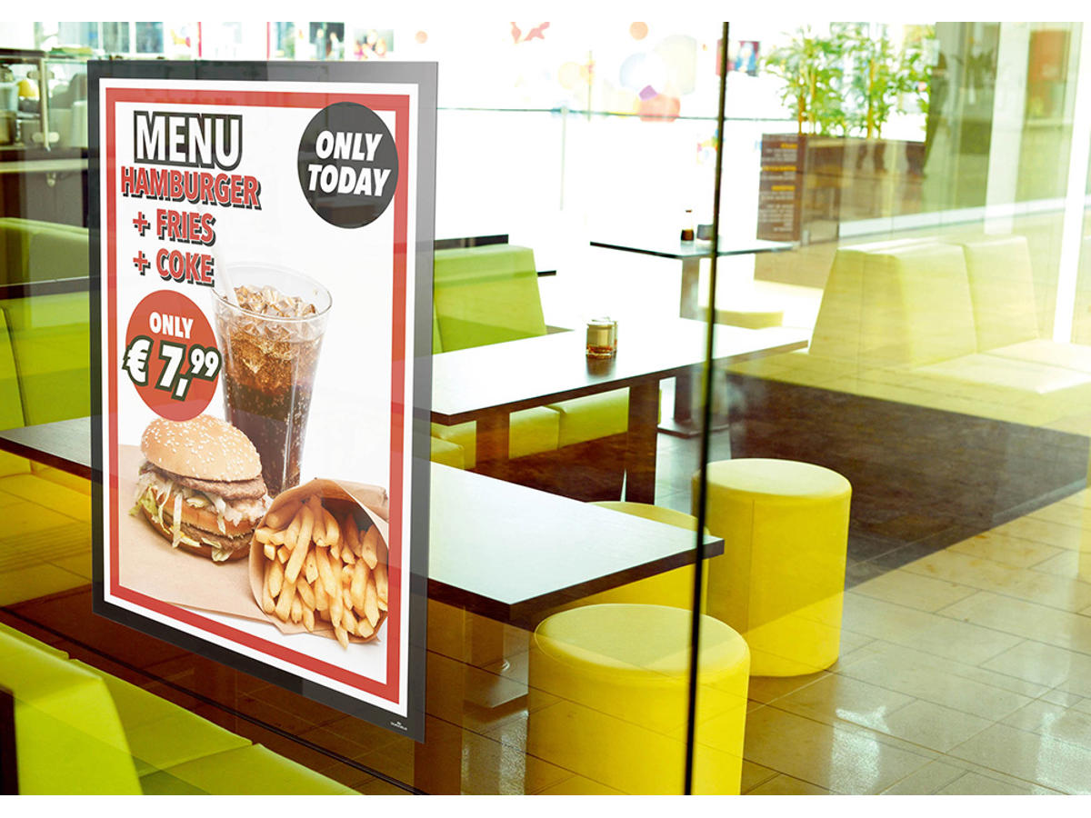 Benyt DURAFRAME® POSTER inforamme til at vise og præsentere salgsfremmende tilbud, åbningstider, reklamer osv. på en professionel måde i butiksvinduer, på vægge eller glasvægge. Rammen holdes sammen med flade magneter langs de lange sider, og det er nemt at indsætte eller ændre beskeder ved at løfte fronten. Let at sætte op - glat og pænt uden bobler - med to selvklæbende strimler på bagsidens korte sider. Plakatrammen kan fjernes fra glatte og faste overflader uden at efterlade rester. Det ser bedre ud end tape! Rammen har plads til 2 plakater (150gr papir) og kan læses fra begge sider med den samme flotte ramme på forsiden som på bagsiden. Fremstillet af PET-plast. Varmebestandig op til 70° og UV-stabil i op til 2 år. Til plakater i A1-format i høj- eller tværformat. Udvendige mål 639 x 886 mm. Praktisk pladsbesparende emballage med 1 sammenrullet ramme.