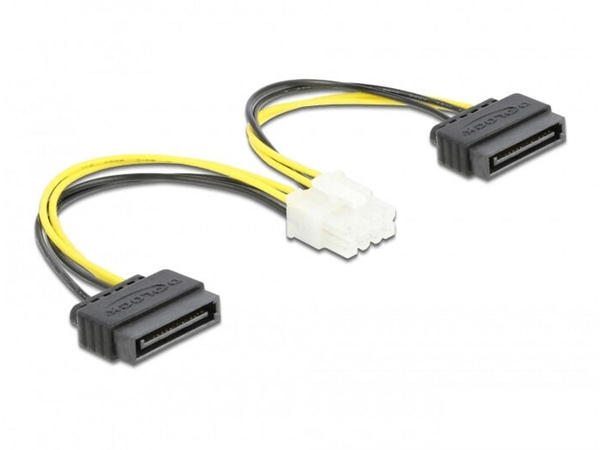 Dieses Stromkabel von Delock dient der Versorgung eines Mainboards mit 8 Pin EPS (12 V) Anschluss an ein Netzteil mit SATA Buchse. Um eine zuverlässige Spannungsversorgung von 12 V zu gewährleisten, müssen beide SATA Stecker an das Netzteil angeschlossen werden.