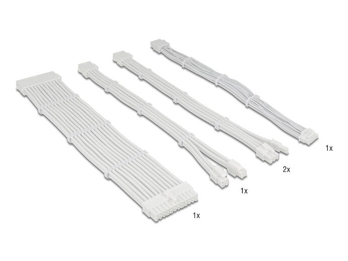 DeLOCK 84542. Stik 1: ATX (24-pin), Stik 2: ATX (24-pin), Kabellængde: 0,3 m. Antal pr. pakke: 5 stk, Emballageindhold: 1 x 24 pin ATX, 1 x 12 + 4 pin 12VHPWR PCIe 5.0, 1 x 4 + 4 pin EPS, 2 x 6 + 2 pin PCIe. Pakketype: Polybag. Oprindelsesland: Kina