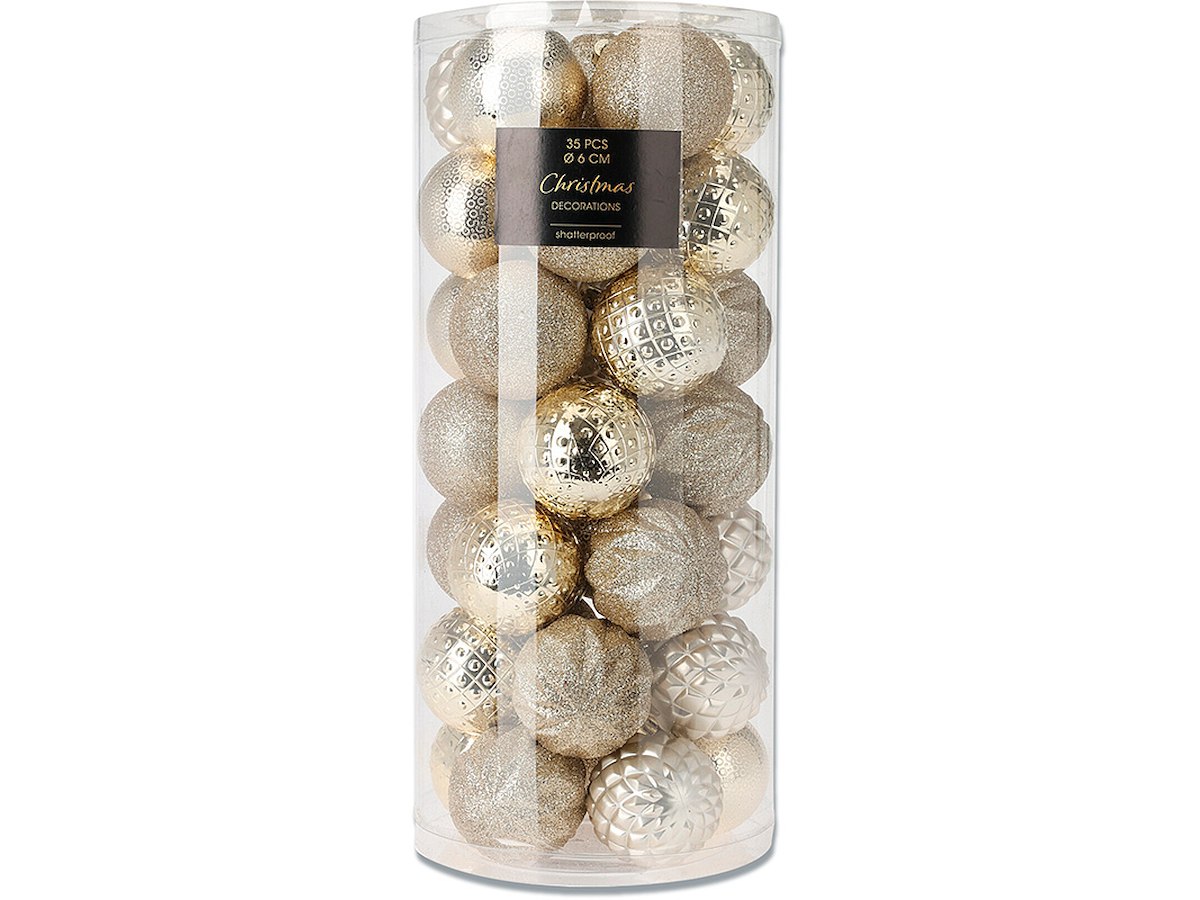 Smukke julekugler i elegante guldnuancer, som passer perfekt til juledekoration i fade, som pynt på bordet eller på juletræet. Pakken indeholder 35 kugler i 5 forskellige varianter. En kolli á 70 kugler passer perfekt til pyntning af et juletræ.