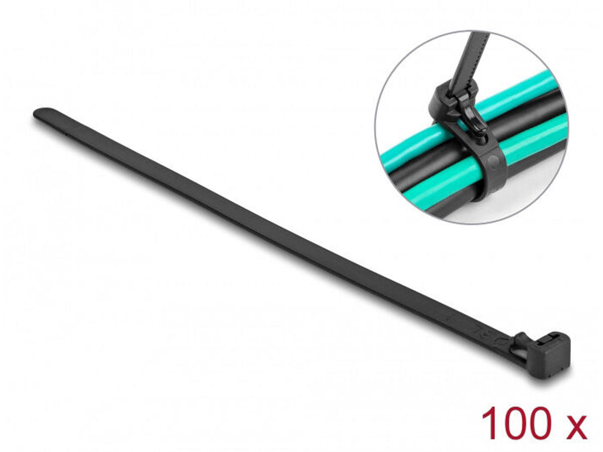 DeLOCK 18757. Type: Krog og løkke kabelbinder, Materiale: Nylon, Produktfarve: Sort. Længde: 200 mm, Bredde: 7,5 mm. Antal pr. pakke: 100 stk