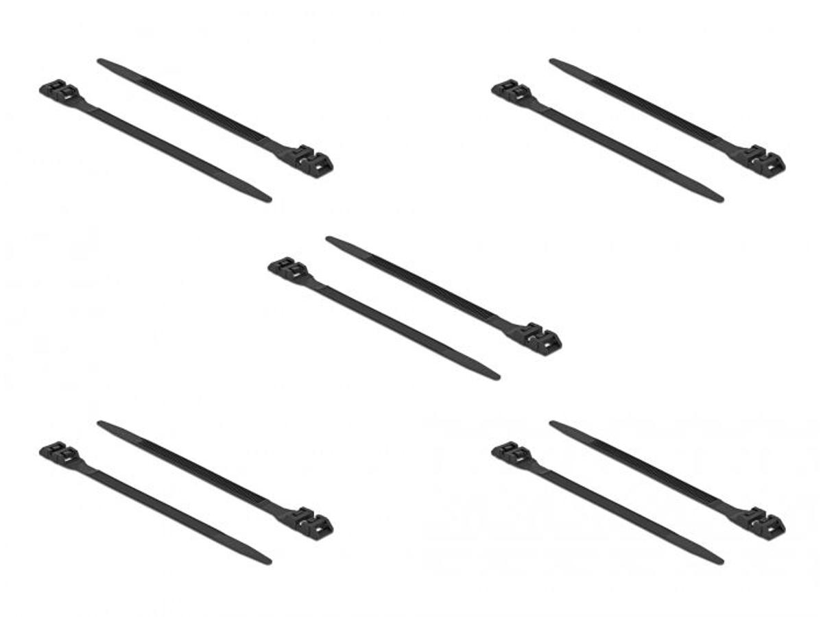 DeLOCK 18891. Type: Udløselig kabelbinder, Materiale: Nylon, Produktfarve: Sort. Længde: 1000 mm, Bredde: 9 mm. Antal pr. pakke: 10 stk