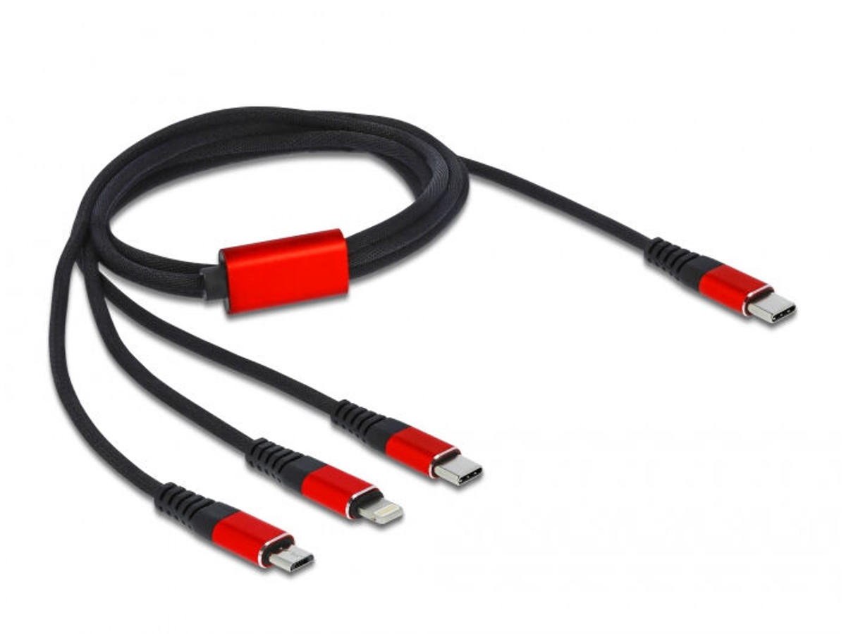 DeLOCK 86711. Kabellængde: 1 m. Stik 1: USB C, Stik 2: USB C/Micro-USB B/Lightning, USB version: USB 2.0, Produktfarve: Sort, Rød