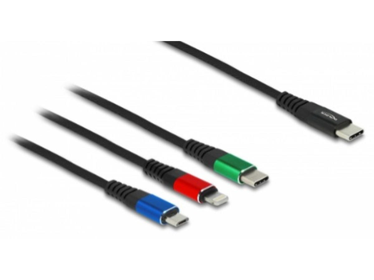 DeLOCK 86596. Kabellængde: 1 m. Stik 1: USB C, Stik 2: USB C/micro-USB B/Lightning, USB version: USB 2.0, Produktfarve: Sort, Blå, Grøn, Rød