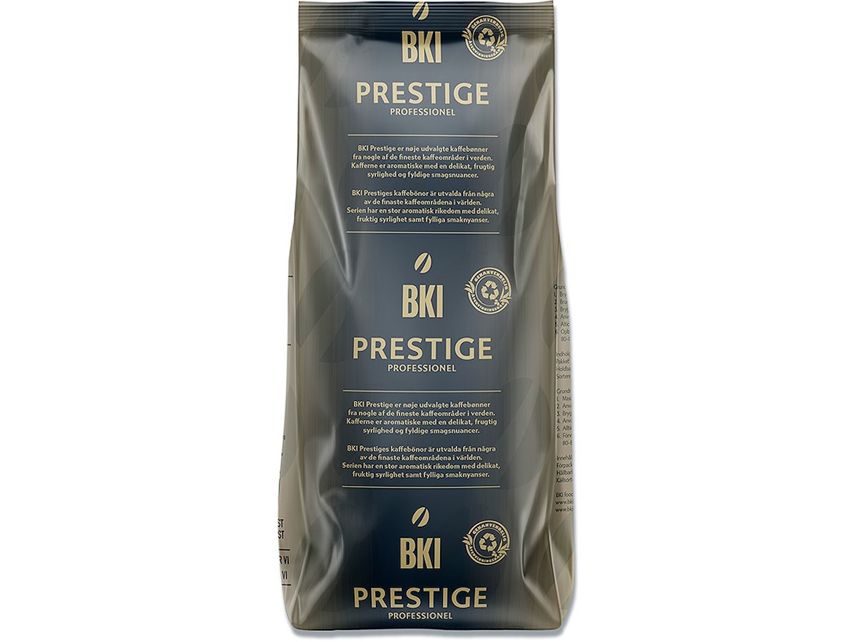BKI Luxus er sammensat af råkaffe fra blandt andet Sydamerika og er mellemristet. Det er en aromatisk kaffe med en rigtig god fylde og en lang, behagelig eftersmag. BKI Prestige kaffeserien består af kaffe af specielt udvalgte kaffebønner af høj kvalitet. Disse kommer fra nogle af verdens allerbedste kaffeområder – Colombia, Brasilien og Indonesien. Prestige-kaffe har vi valgt at lys- eller mellemriste for at bevare flest mulige af de fine og naturlige æteriske olier i kaffen – og bevare fylden og den udsøgte syrlighed. Med Prestige-kaffe får du frugtagtig og mild gourmetkaffe, der er harmonisk og intens - med stor personlighed. Prestige-kaffe er det perfekte match til stempelkander, kandebryg og bryganlæg. Denne kaffe bliver leveret i Danmarks første genanvendelige kaffepose i plast, som efter brug kan blive til nye plastprodukter, når den sorteres som "blød plast".