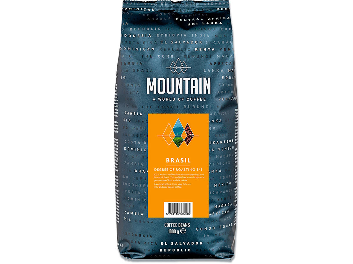 Mountain Brasil er 100% Arabica fra Brasilien. Det er en kaffe med en flot krop med rene noter af frugt og chokolade og en god struktur. Det er en virkelig behagelig, god og blød kop kaffe. Mountain kaffe er en serie af hele bønner. Vores varesortiment består af rene kaffer, blandingskaffer og smagskaffer. Vi har en kaffe fra - næsten - alle kaffedyrkende områder i verden. Bønner leveres i 1 kg vakuumposer med ventil. Denne ventil betyder, at de nyristede bønner kan pakkes kort tid efter ristning, og at den fulde smag og aroma dermed bibeholdes. Ventilposen giver bønnerne en holdbarhed på et år.
