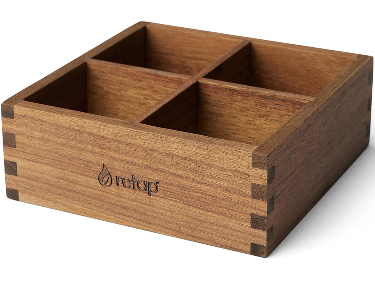Retap Flavour Trækasse –Medium. Den eksklusive Retap Flavour Trækasse er designet til at opbevare og organisere dine Retap Flavour-pakker. Denne kasse, fremstillet af førsteklasses akacietræ, tilfører et naturligt præg til køkkenet, spisestuen eller kontoret. Den lille Retap Flavour Trækasse er en praktisk tilføjelse til hjemmet eller kontoret, der hjælper dig med at holde dine Retap Flavour-tabs organiseret og inden for rækkevidde. Det enkle design passer til forskellige indretningsstile, og kassen er en nyttig og stilfuld opbevaringsløsning. Akacietræet er kendt for sine rige, varme toner og holdbarhed, og opdelingen gør det nemt at holde styr på forskellige smagsvarianter. Den elegante og praktiske kasse er ideel til sundhedsbevidste kolleger, venner eller enhver, der værdsætter et velorganiseret køkken. Mål: 15x15x5,5 cm