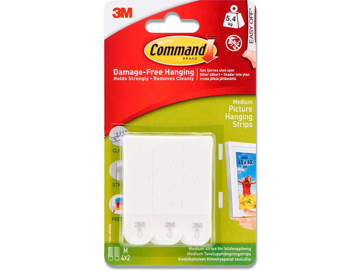 Nem montering uden søm eller skruer. Dobbeltklæbende tape, som kan flyttes eller fjernes uden at beskadige overfladen eller efterlade limrester. Medium, 4 par med monteringsstrips.