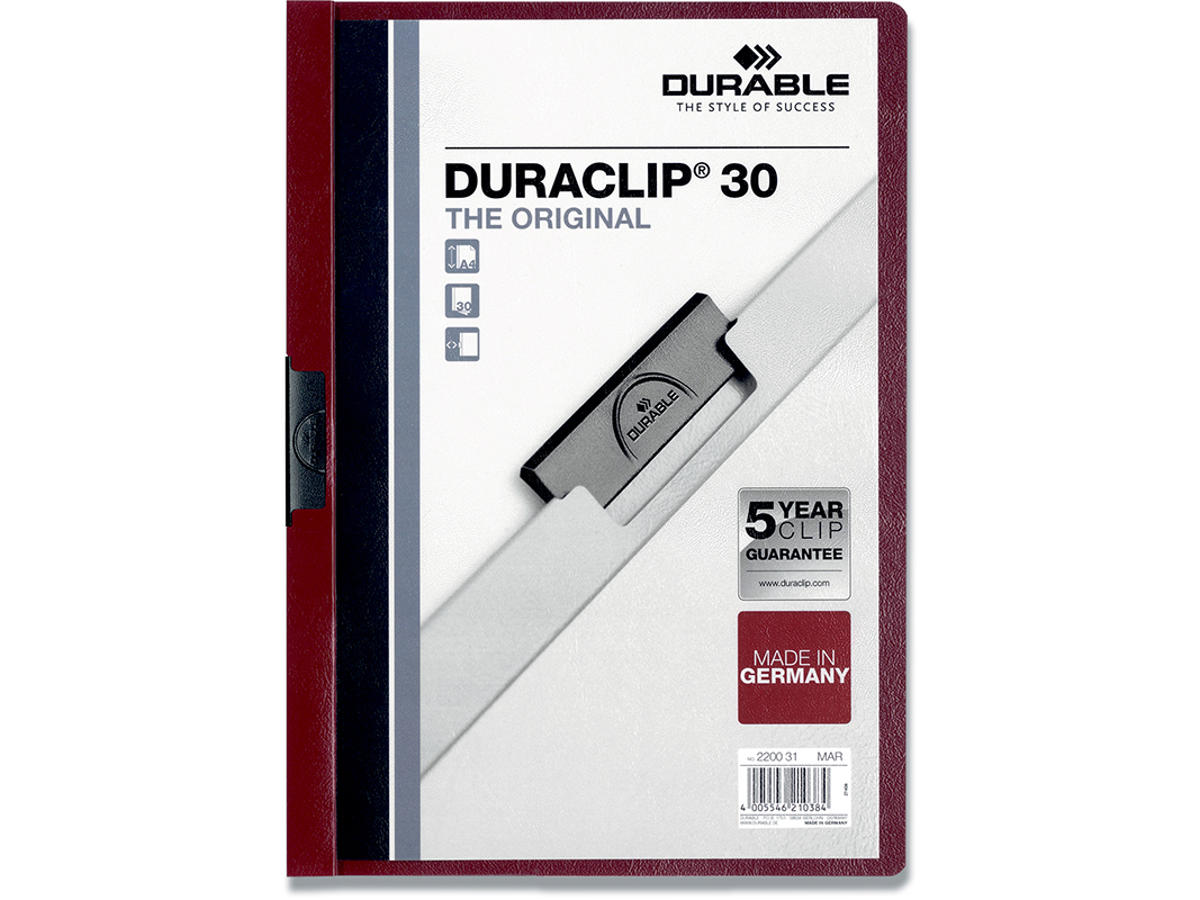 Universalmappen er perfekt til præsentationer, tilbud, rapporter osv. som ikke behøver at blive hullet. Den unikke metalklemme holder dokumenterne på plads. DURACLIP® 30 har en transparent forside og farvet bagside, og kan rumme op til 30 A4 sider. Enkel at anvende: træk klemmen ud, læg dokumenterne i, skyd klemmen tilbage og dokumenterne sidder fast. Den unikke klemme tilpasser sig efter antallet af sider gang efter gang! 5 års garanti på klemmen.