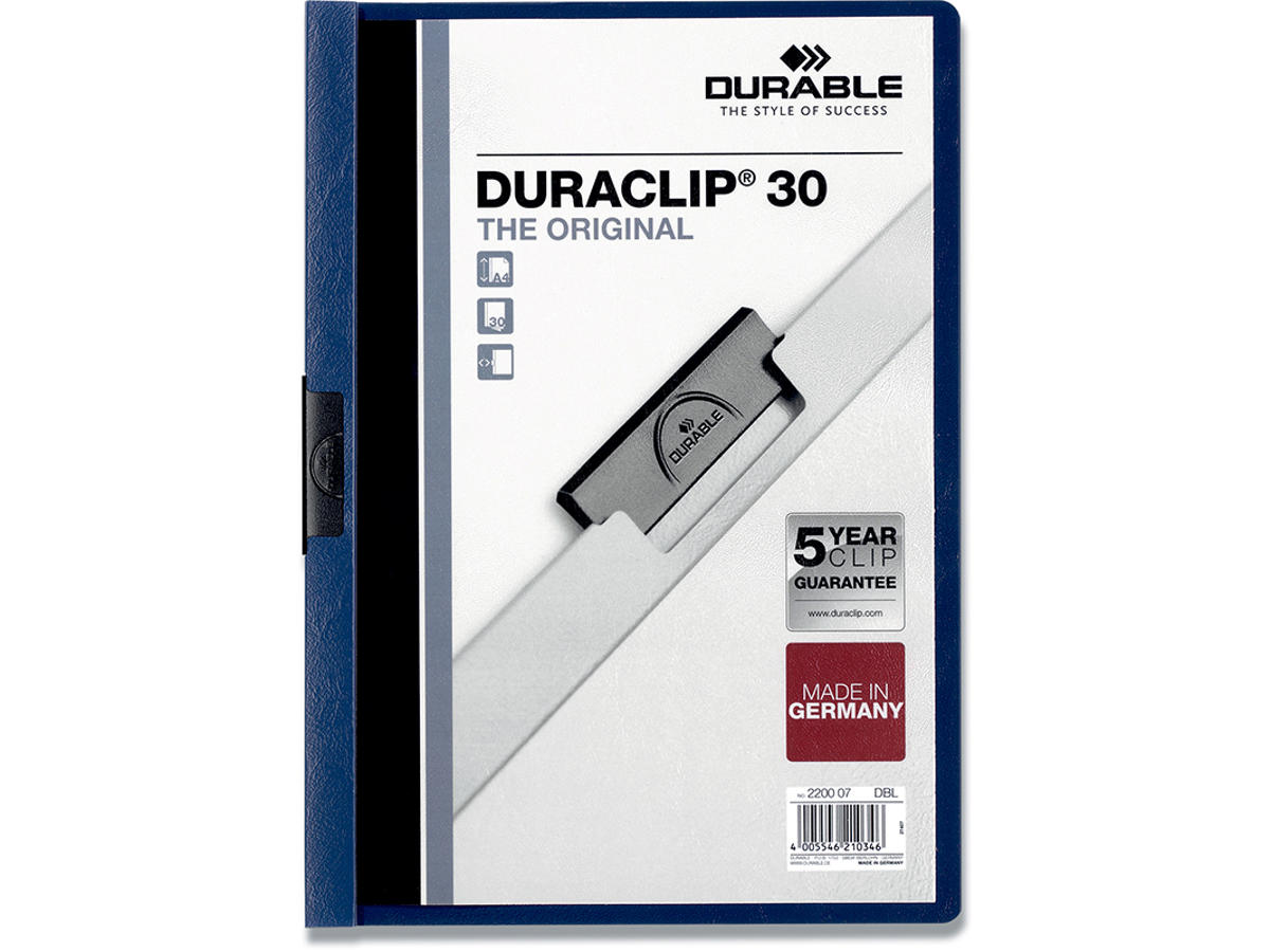 Universalmappen er perfekt til præsentationer, tilbud, rapporter osv. som ikke behøver at blive hullet. Den unikke metalklemme holder dokumenterne på plads. DURACLIP® 30 har en transparent forside og farvet bagside, og kan rumme op til 30 A4 sider. Enkel at anvende: træk klemmen ud, læg dokumenterne i, skyd klemmen tilbage og dokumenterne sidder fast. Den unikke klemme tilpasser sig efter antallet af sider gang efter gang! 5 års garanti på klemmen.