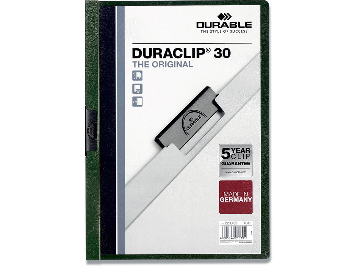 Klemmappe, 30 ark, Mørkegrøn, Transparent forside, Durable DURACLIP 30